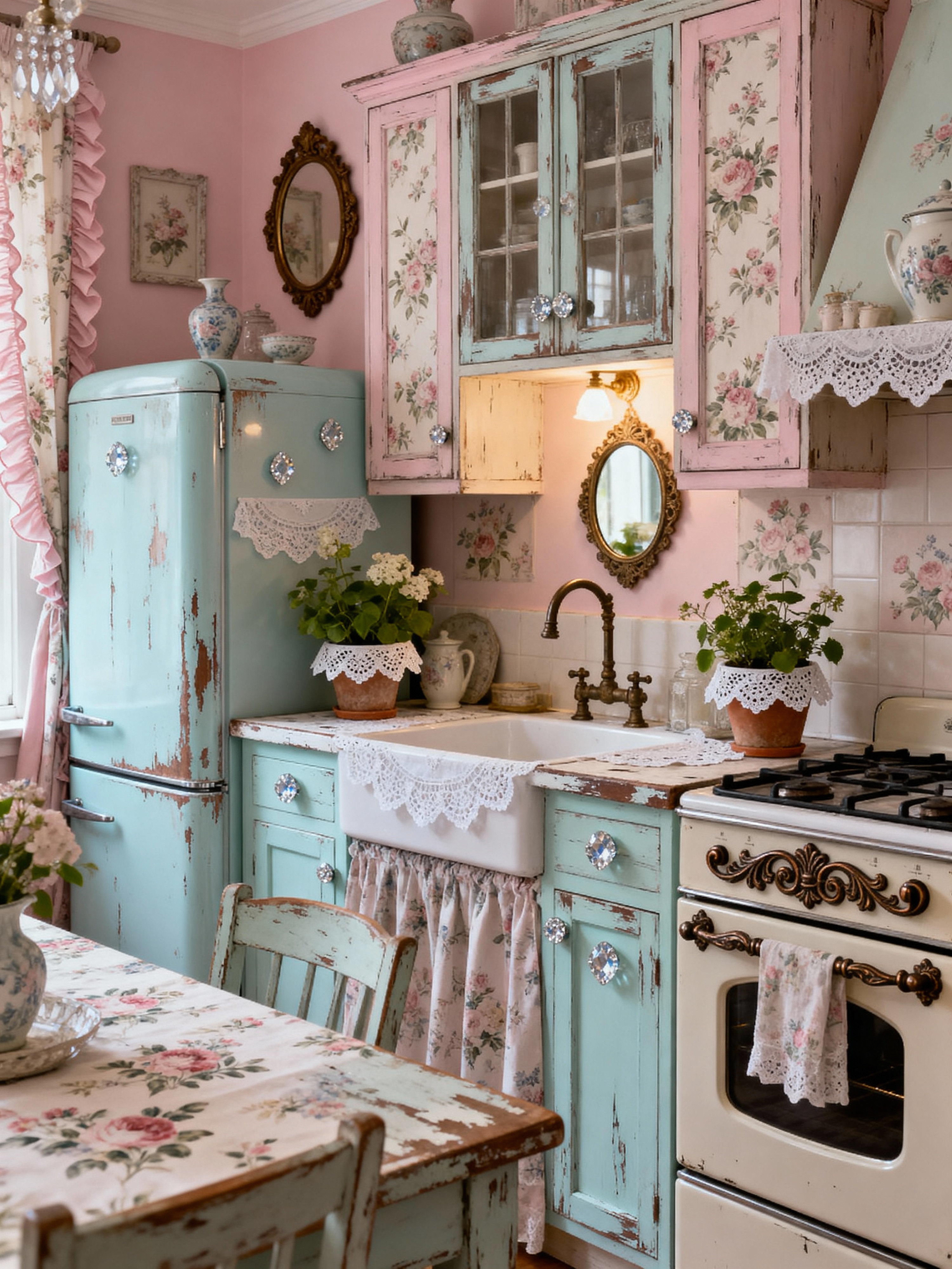kitchen with shabby chic style with worktops and refrigerator and kitchen cabinets and sink and plant and stove and worktops. . with delicate details and weathered finishes and romantic style and soft textures and distressed furniture and feminine touches and pastel colors and floral patterns