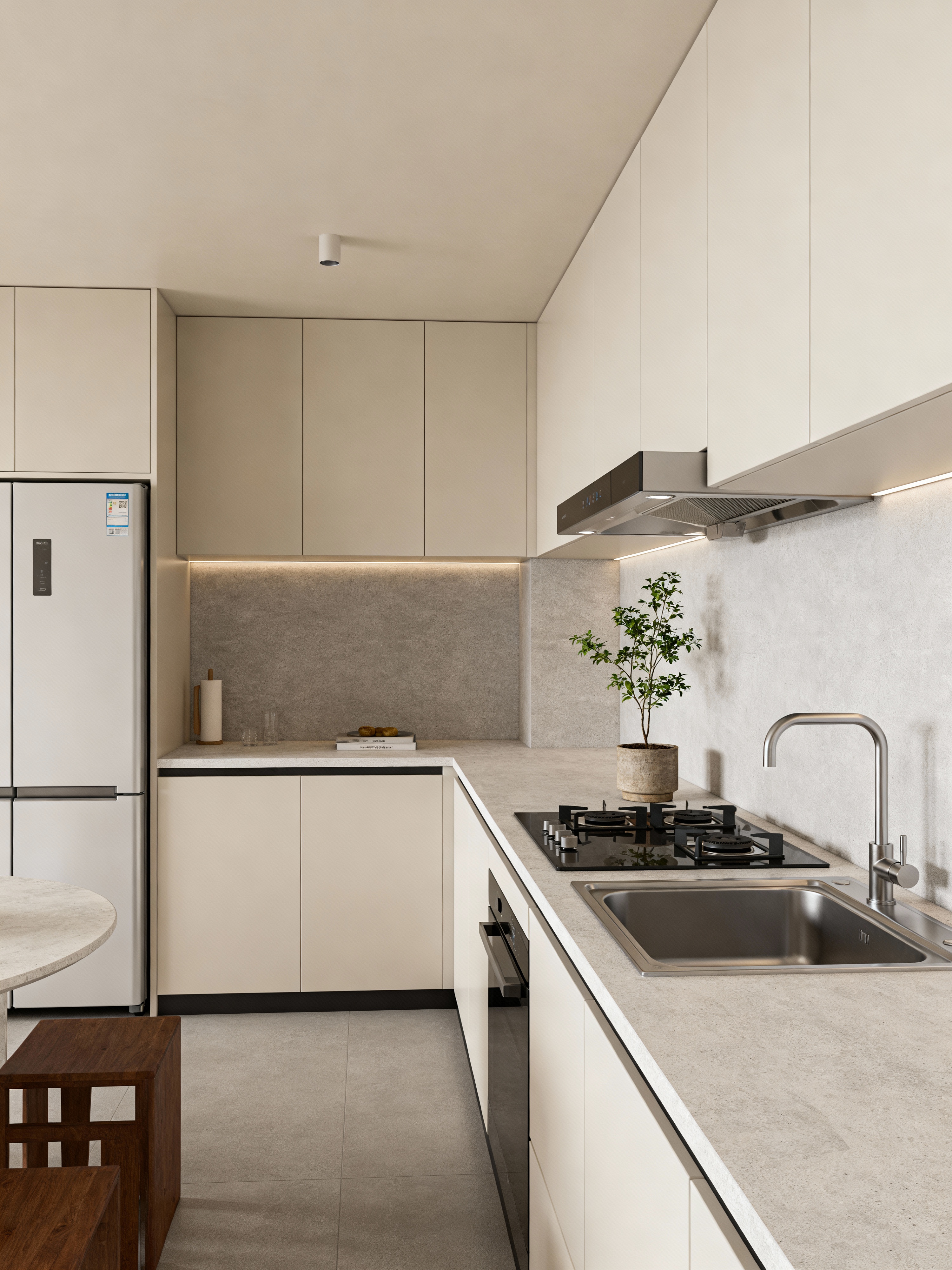 kitchen with simple style with refrigerator and worktops and kitchen cabinets and plant and stove and sink and refrigerator. . with calm atmosphere and uncluttered space and clean design and basic elements and minimal decor and neutral colors and functional furniture and pure simplicity