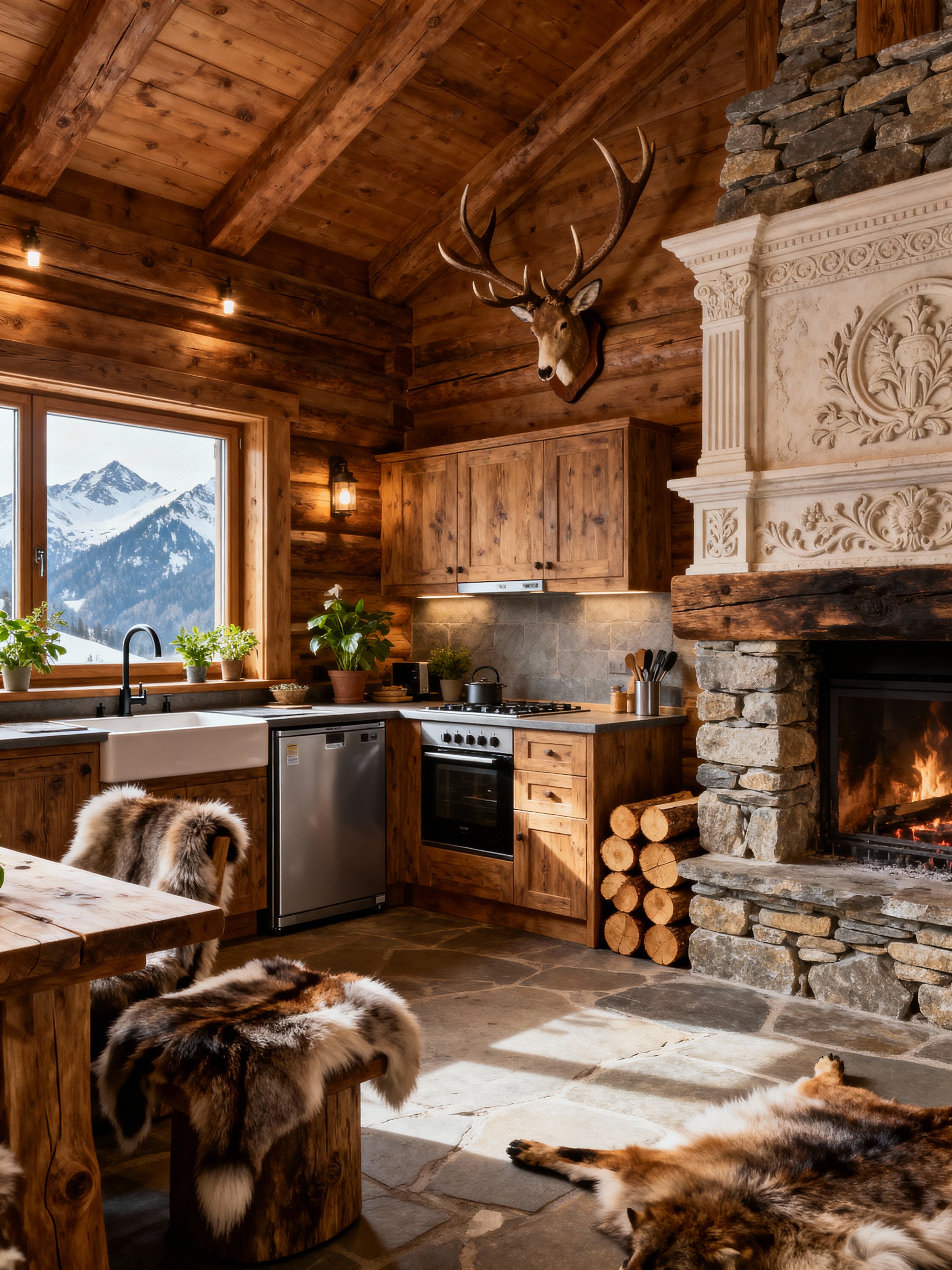 kitchen with ski chalet style with worktops and refrigerator and sink and kitchen cabinets and stove and plant and worktops. . with window with mountain views and wooden logs and rustic and stone fireplace and decorative carving and mouldings and animal furs and wooden walls and hanging wall elk antler