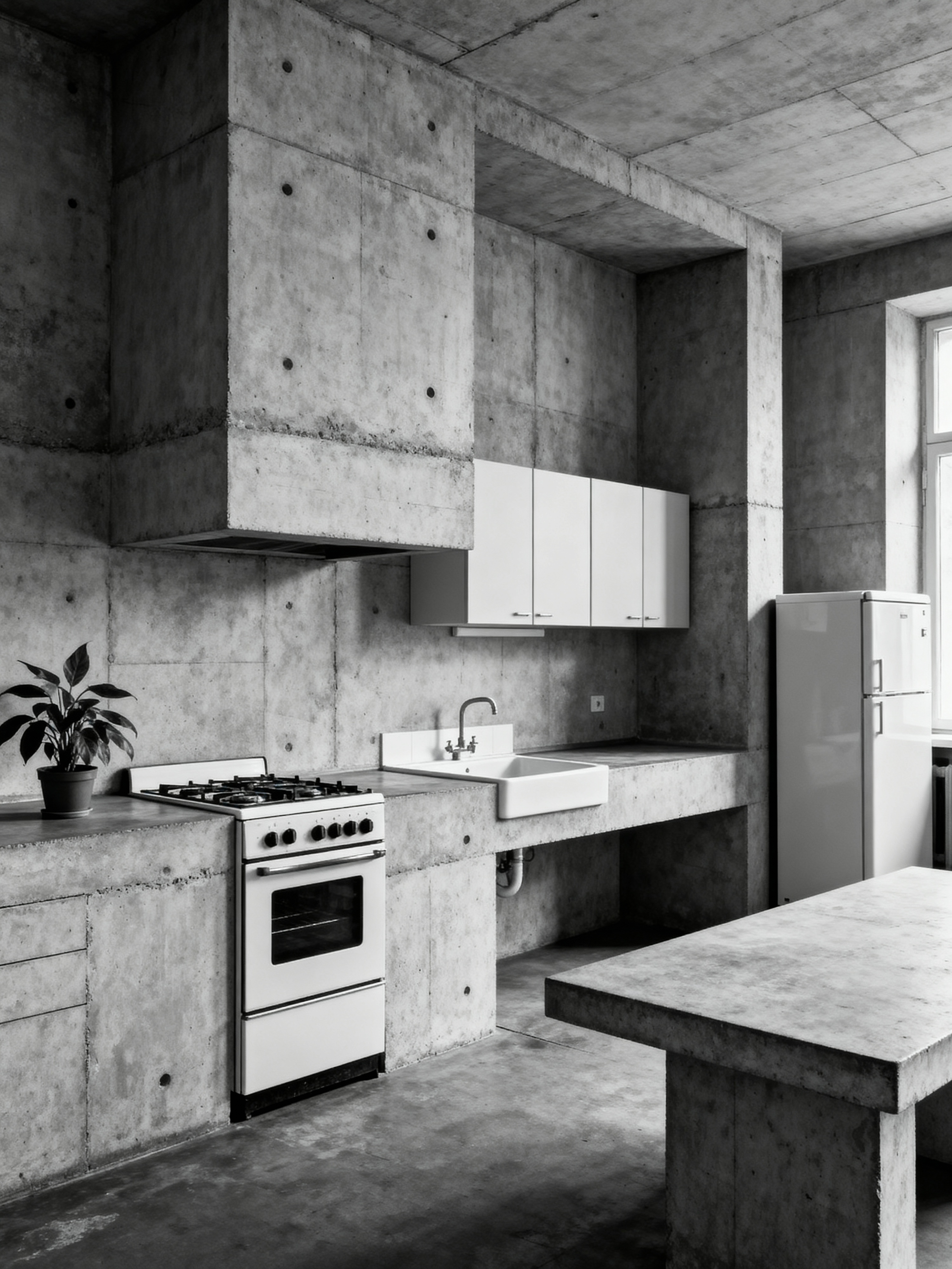kitchen with soviet style with stove and sink and plant and refrigerator and worktops and kitchen cabinets and stove. . with monumental scale and concrete structures and socialist realism and utilitarian design and functional furniture and institutional look and brutalist style and austere aesthetic