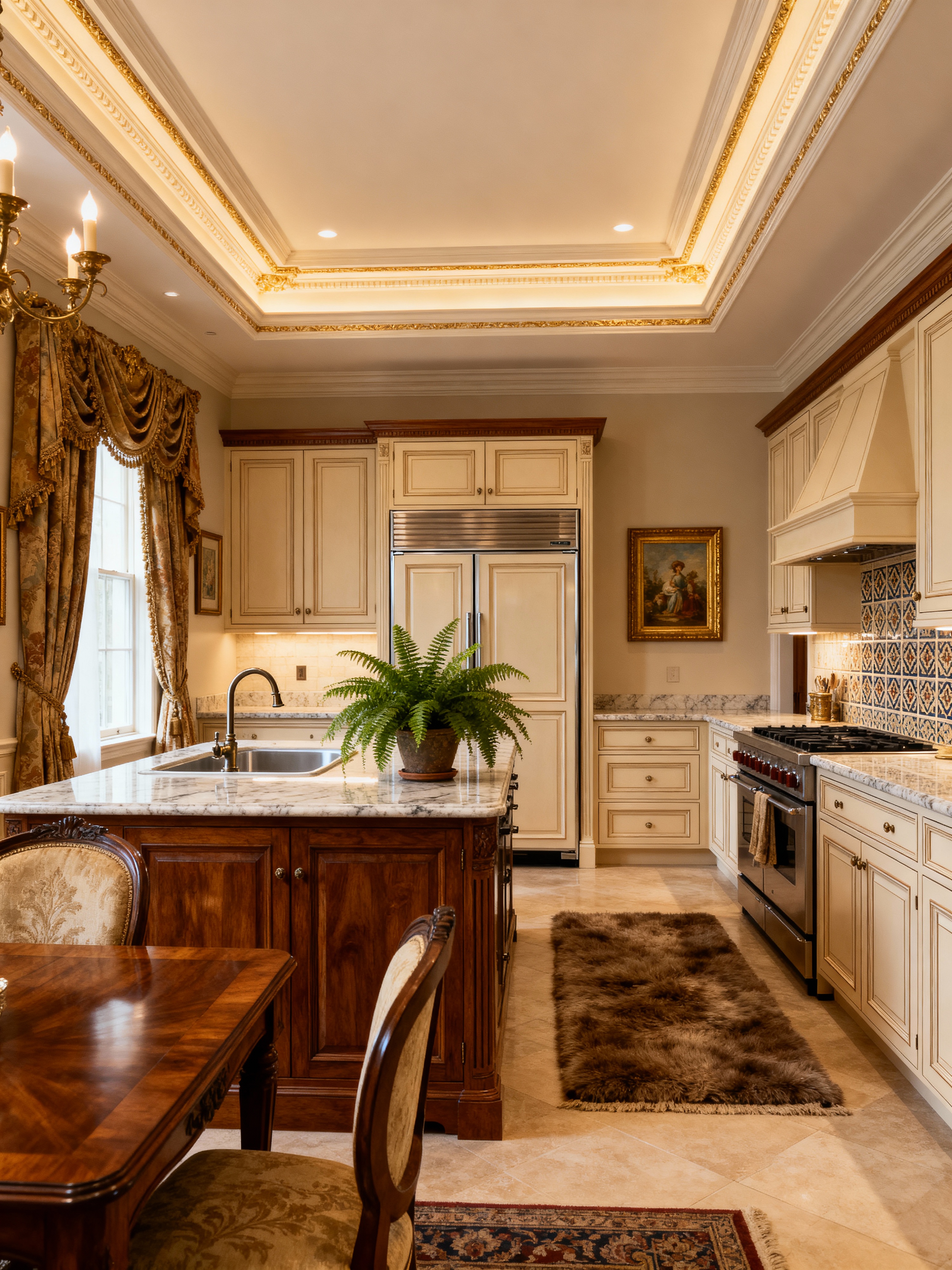 kitchen with traditional style with kitchen cabinets and sink and plant and worktops and refrigerator and stove and kitchen cabinets. . with symmetrical layout and crown molding and timeless design and formal furniture and warm colors and antique pieces and rich fabrics and luxurious textiles