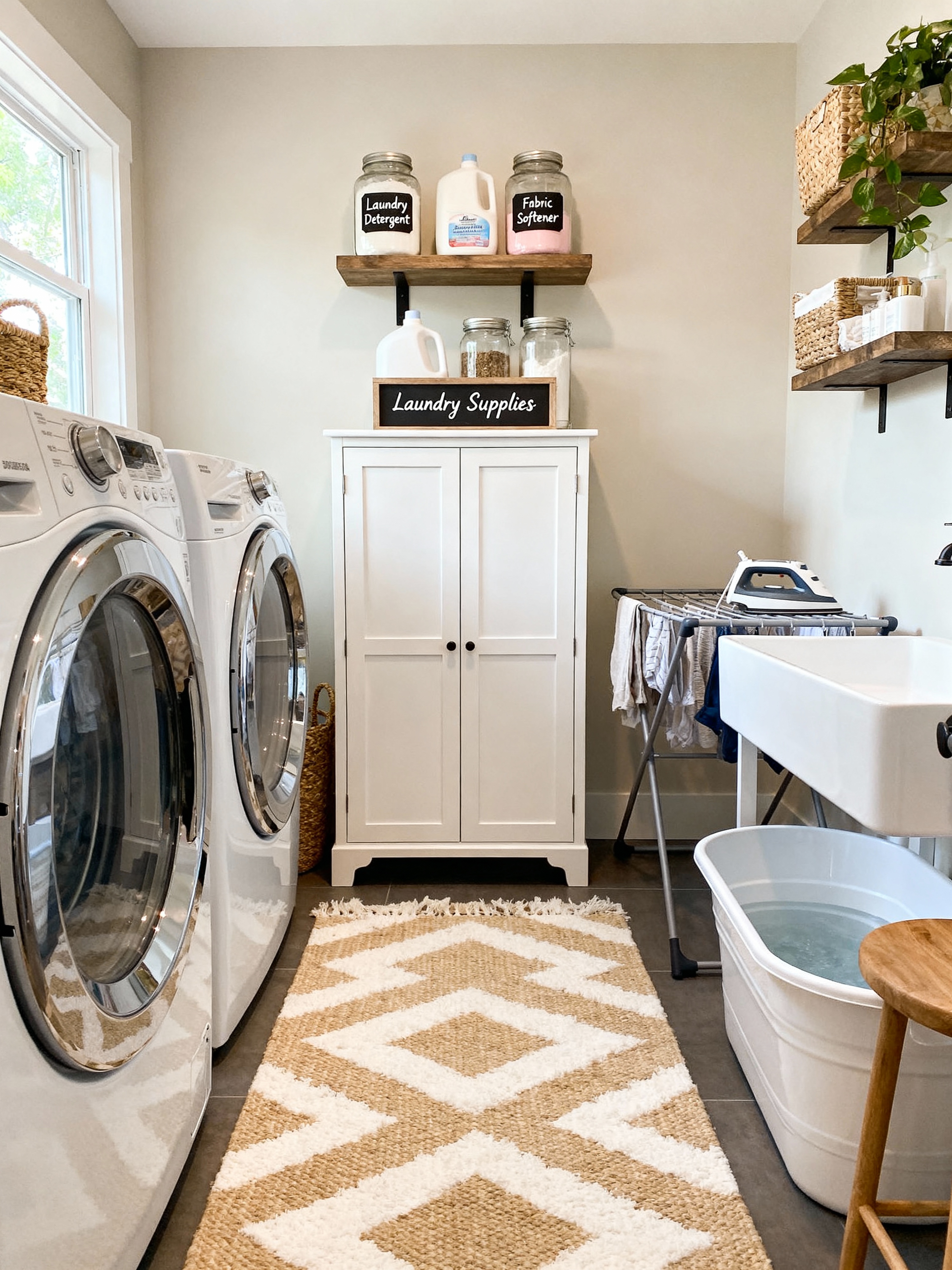 laundry room with airbnb style with clothes dryer and area rug and laundry jars and floating shelves and cabinet and iron and drying racks and laundry tub. . with open and natural lighting and simple, clean lines and simplistic furniture and scandinavian style and practicality and functionality and neutral walls and textures and natural materials and elements and simple color palette and open and natural lighting