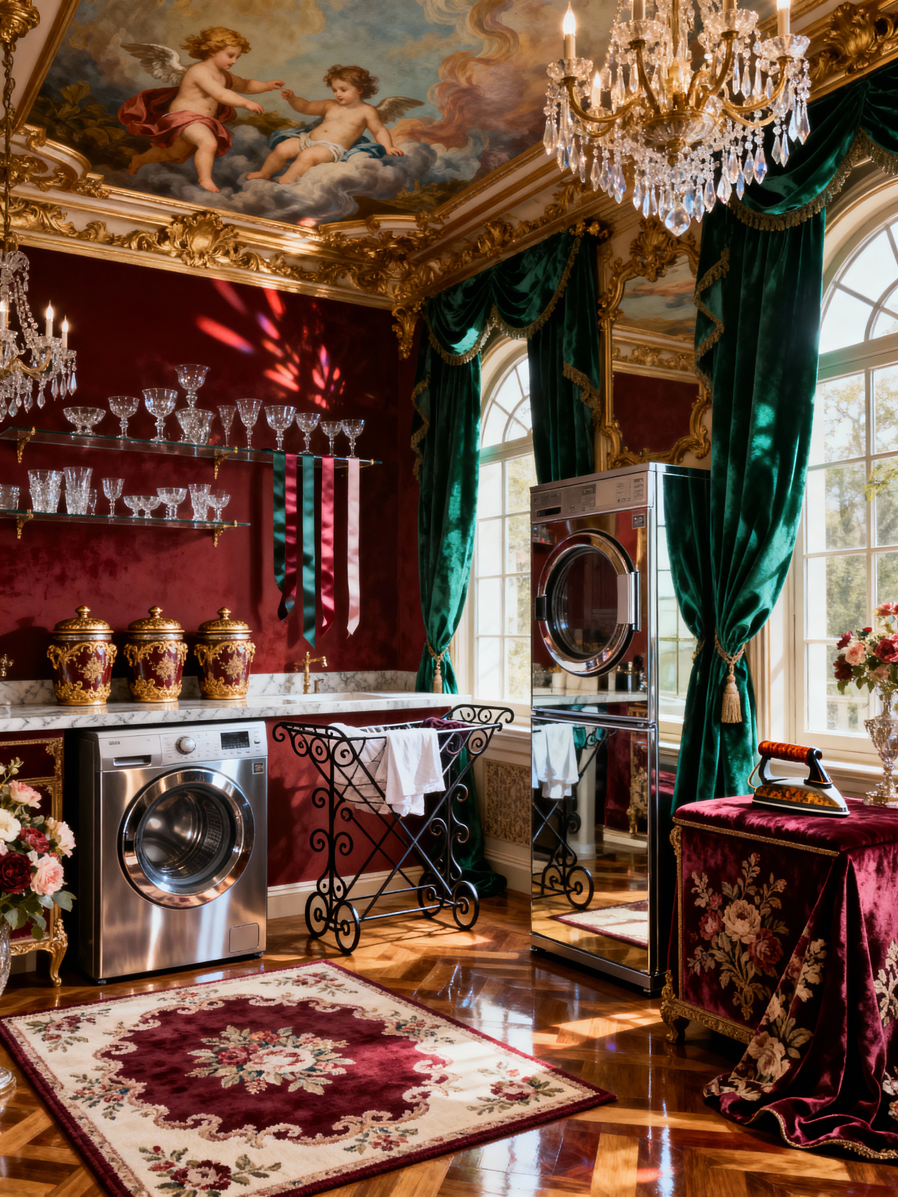 laundry room with baroque style with washing machine and area rug and laundry jars and drying racks and clothes dryer and iron and cabinet and floating shelves. . with luxurious floral and damask fabrics and sensuous richness and movement and dynamism and tension and emotional exuberance and heavy moldings and expensive and plush flooring