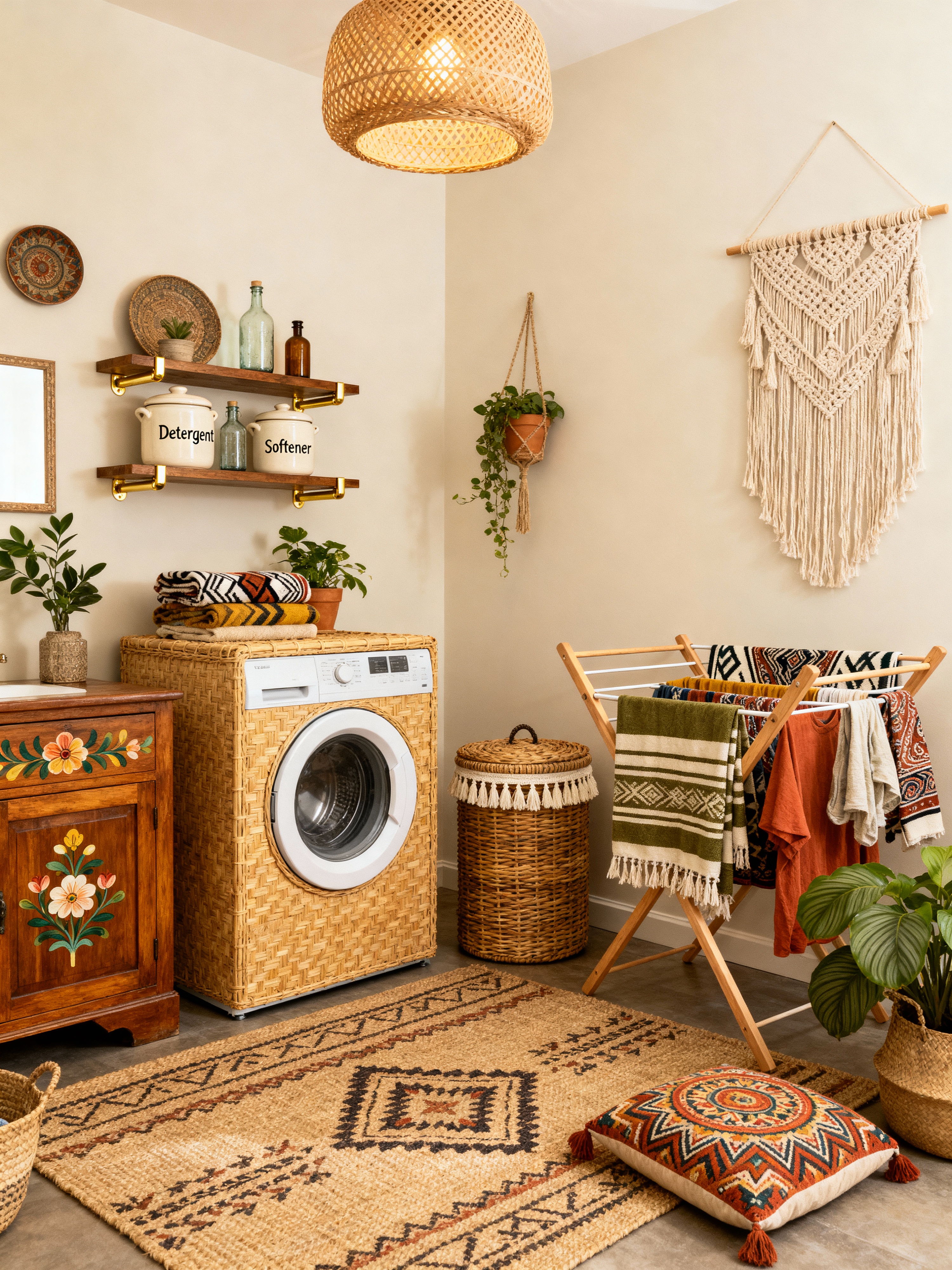 laundry room with boho-chic style with iron and floating shelves and area rug and clothes hamper and washing machine and cabinet and laundry jars and drying racks. . with relaxed atmosphere and natural materials and eclectic mix and global artifacts and vintage finds and layered textiles and free-spirited and mixed patterns
