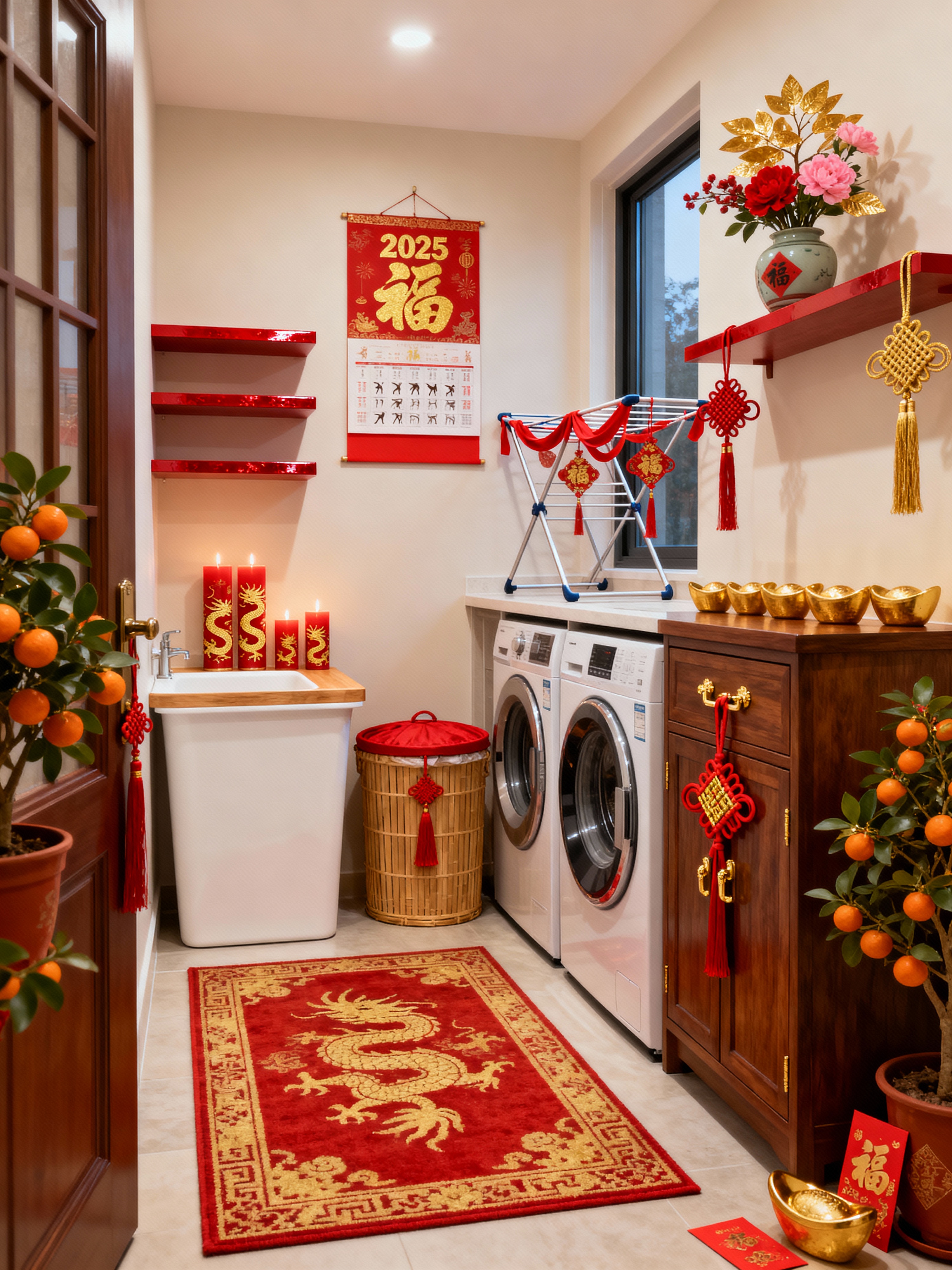 laundry room with chinese new year style with area rug and laundry tub and floating shelves and clothes hamper and clothes dryer and washing machine and cabinet and drying racks. . with zodiac calendar and orange trees and red and gold tassels and chinese knots and red and gold candles and money tree and gold ingots and mei hwa flowers