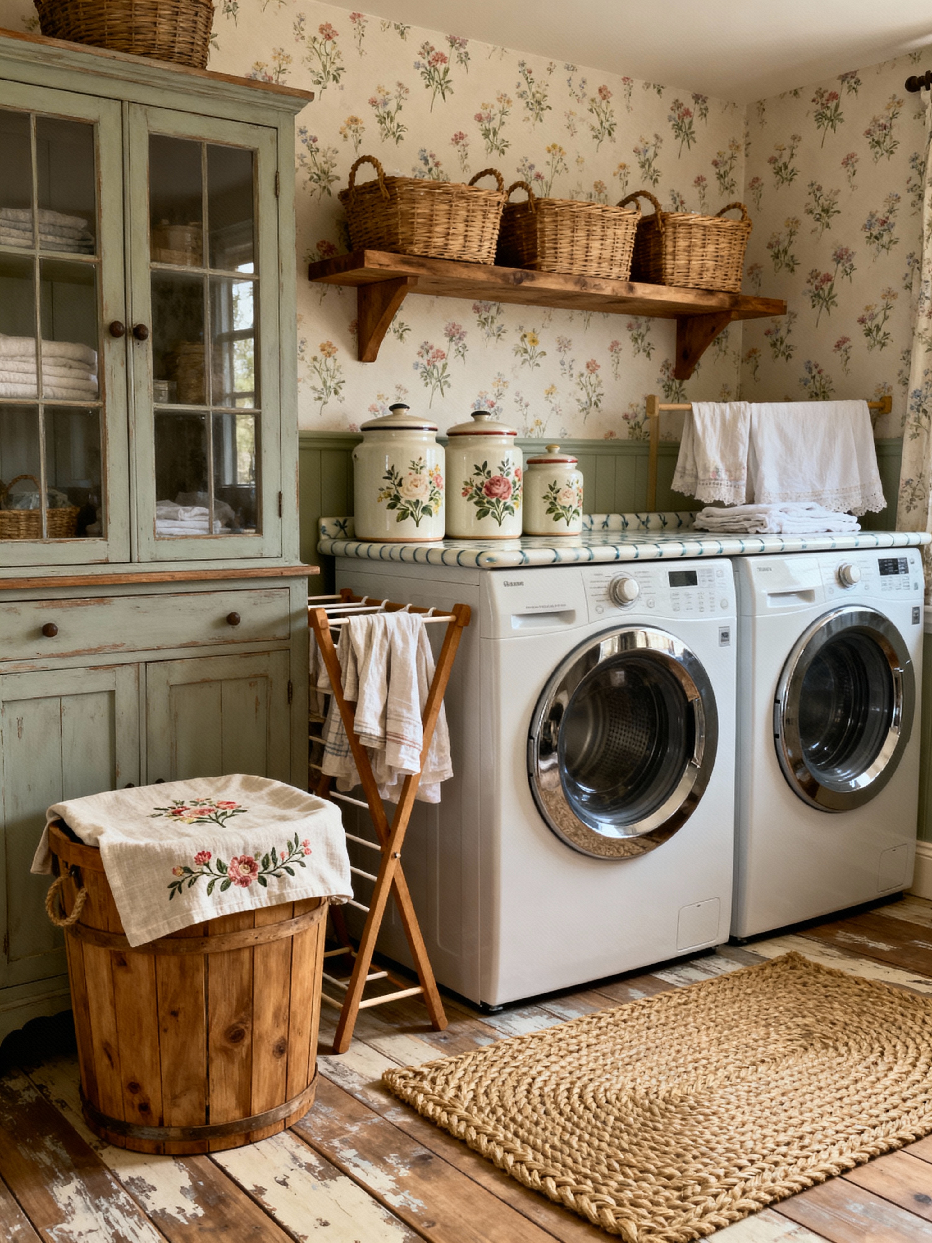 laundry room with cottagecore style with clothes hamper and laundry jars and washing machine and floating shelves and drying racks and area rug and cabinet and clothes dryer. . with traditional and country style and earthy and cottage style and natural and muted colors and organic and floral patterns