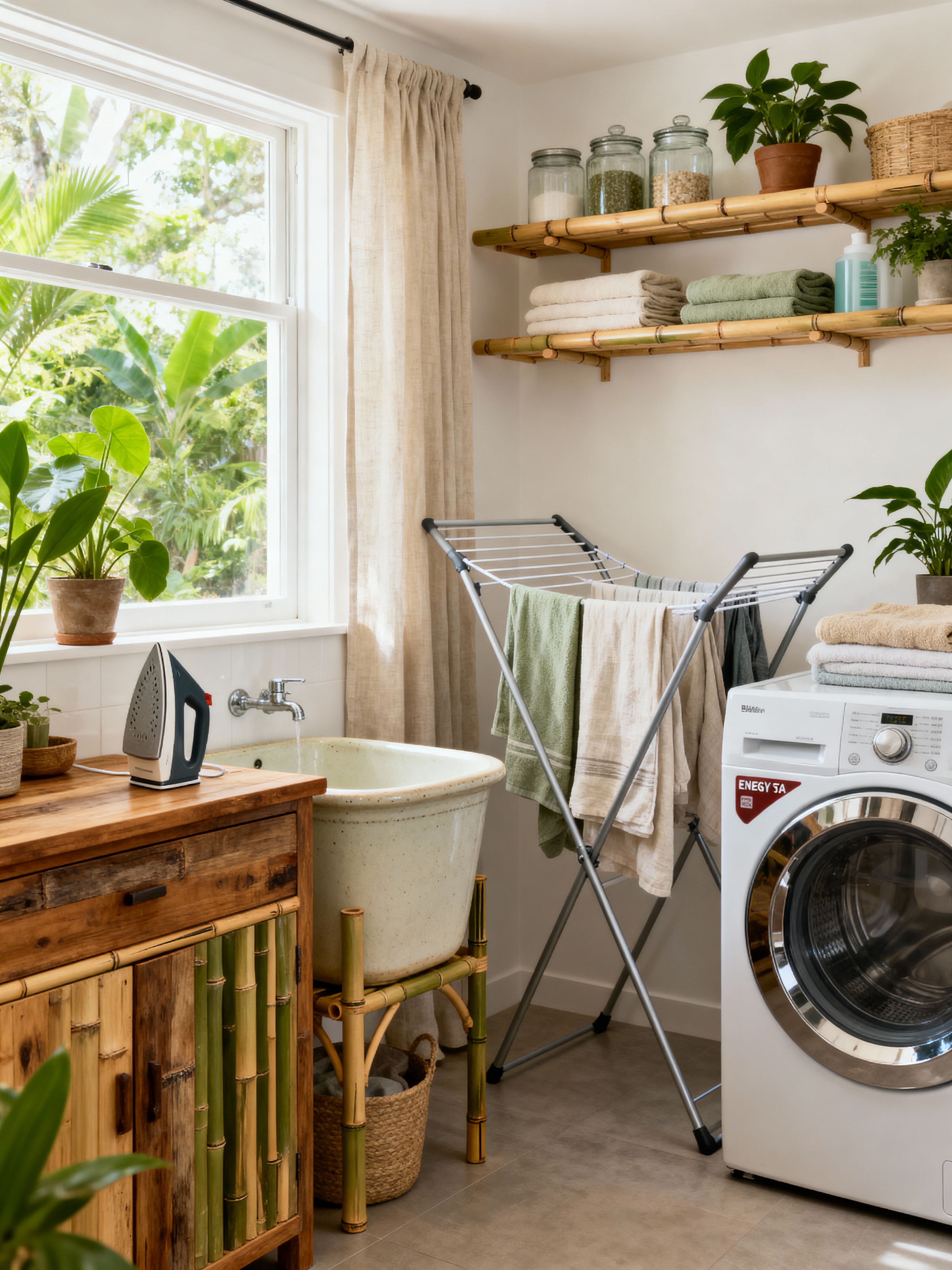 laundry room with eco-friendly style with cabinet and iron and laundry tub and clothes dryer and drying racks and floating shelves and laundry jars and washing machine. . with organic textiles and environmentally conscious and non-toxic finishes and energy efficient and recycled elements and renewable resources and sustainable materials and green living