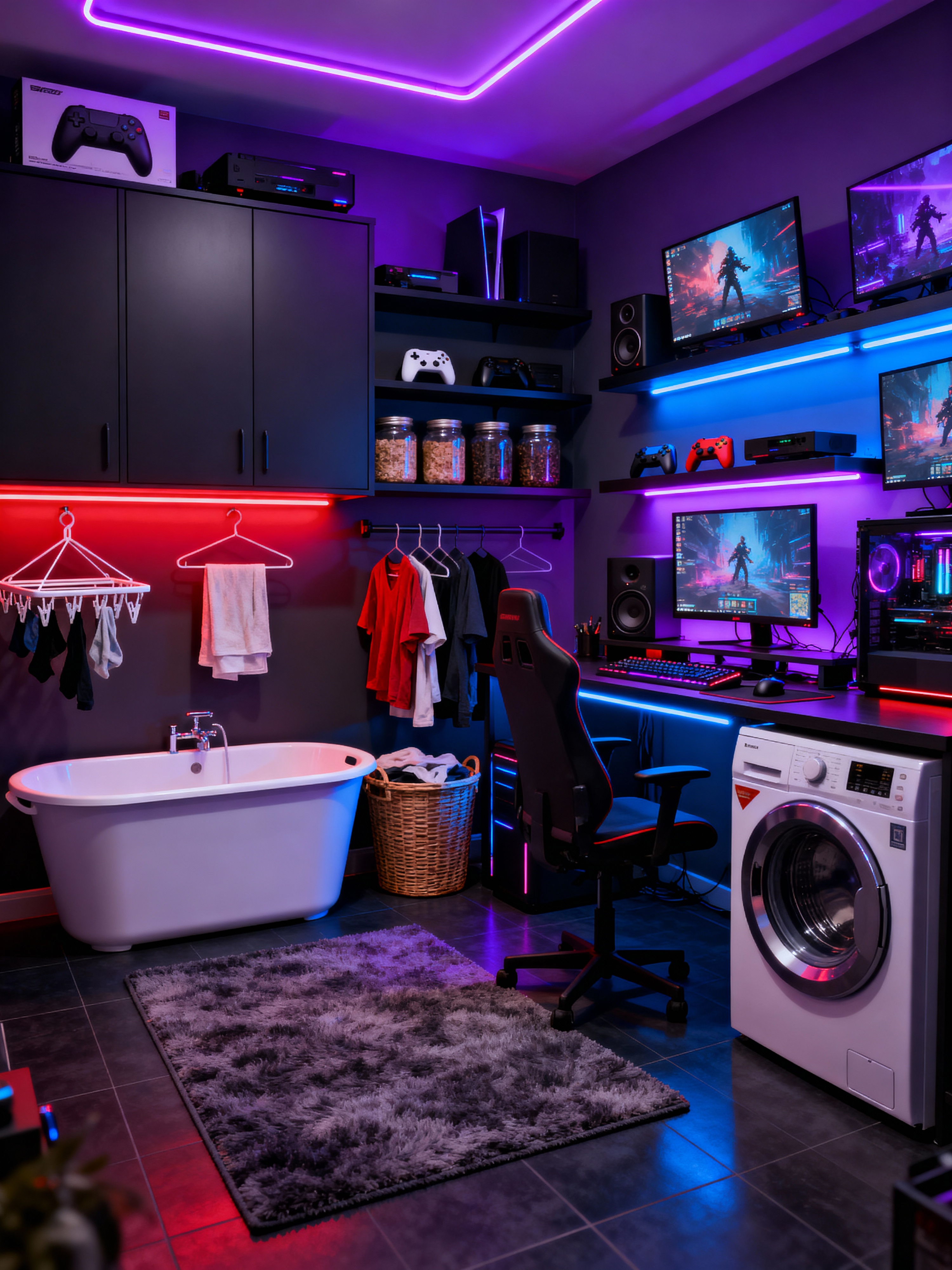 laundry room with gaming room style with cabinet and laundry tub and area rug and floating shelves and clothes hamper and laundry jars and drying racks and washing machine. . with multiple displays and purple, red and blue fade light and video game consoles and dark lit room and neon lights and speakers and computer desk with computer displays and keyboard and dark room