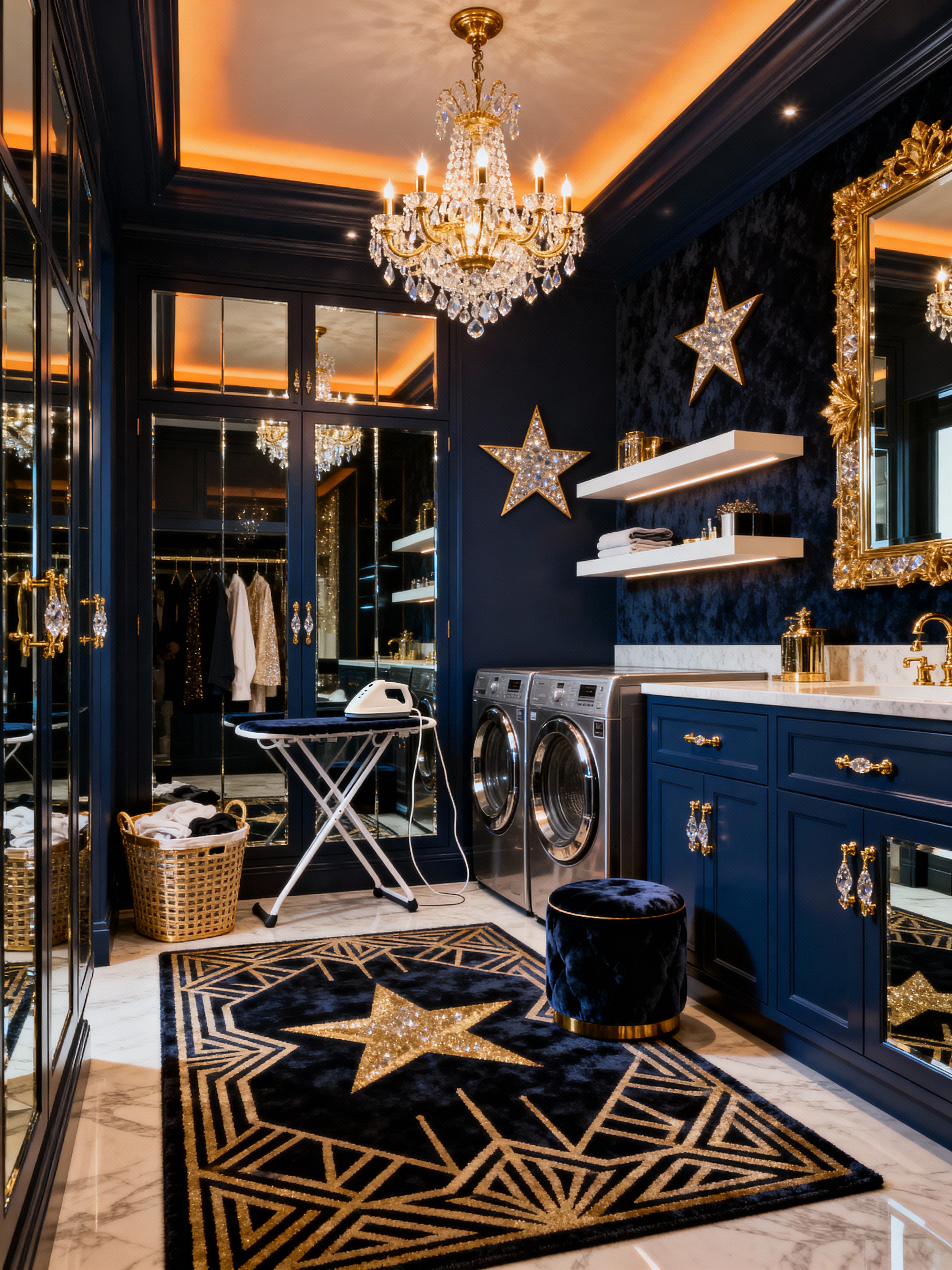laundry room with hollywood glam style with clothes dryer and clothes hamper and area rug and iron and cabinet and floating shelves and washing machine and drying racks. . with mirrored surfaces and crystal chandeliers and dramatic lighting and glamorous style and art deco influence and star quality and velvet upholstery and opulent details