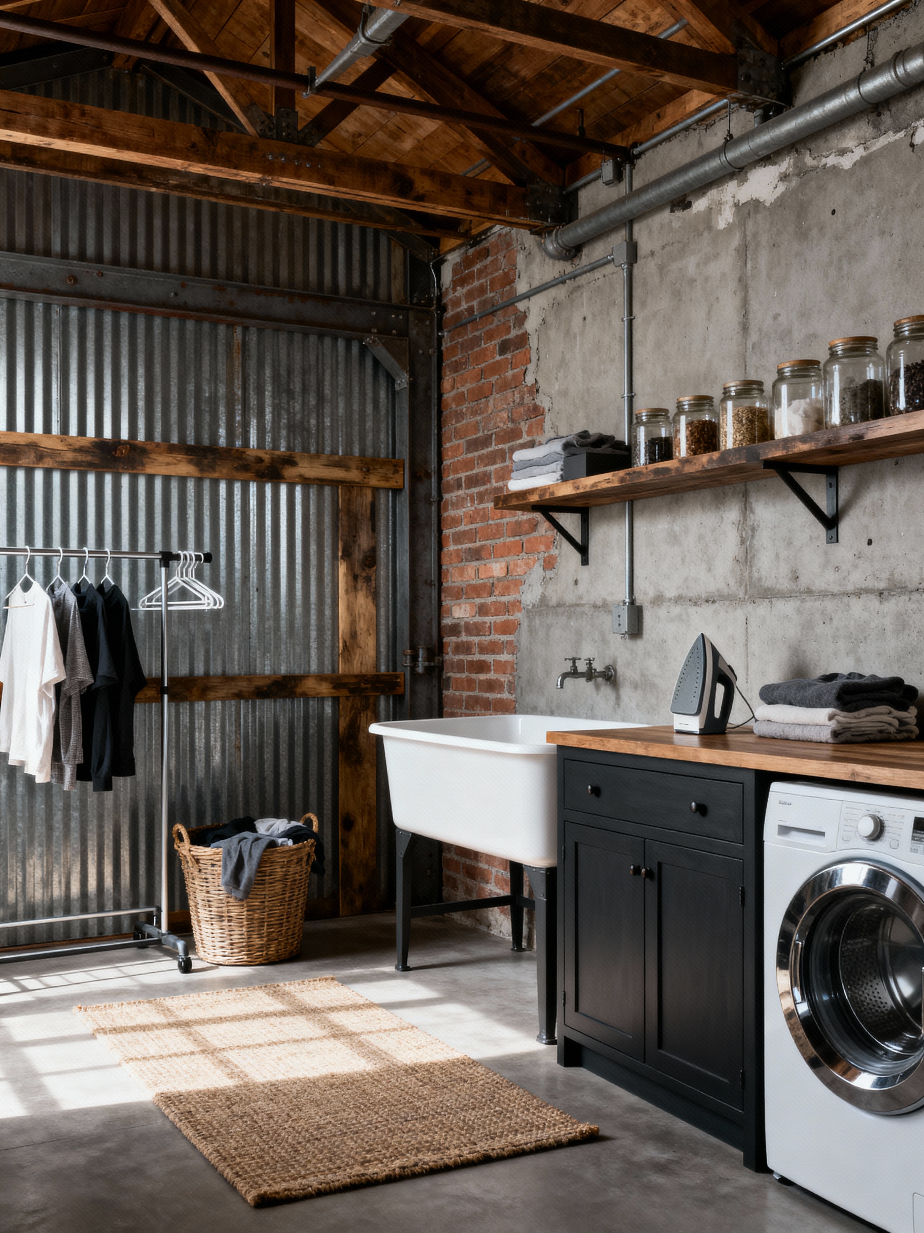 laundry room with industrial style with floating shelves and laundry jars and drying racks and clothes hamper and area rug and iron and cabinet and laundry tub. . with exposed rafters and factory style and metal panels and exposed concrete and raw aesthetic and utilitarian objects and reclaimed wood and exposed brick