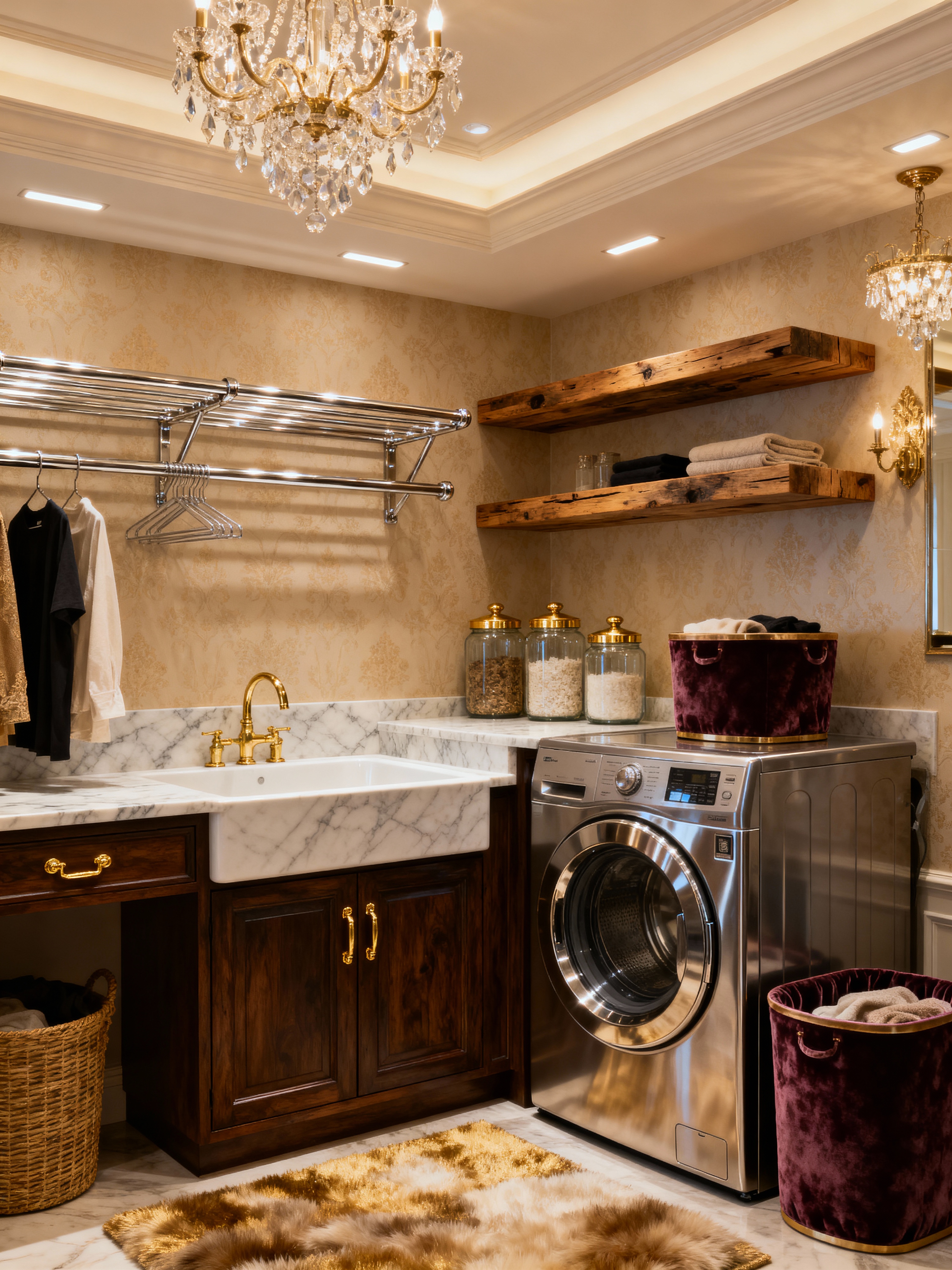 laundry room with luxury style with washing machine and clothes dryer and laundry jars and clothes hamper and laundry tub and cabinet and drying racks and floating shelves. . with rich textures and lavish comfort and opulent details and sophisticated style and elegant lighting and premium finishes and designer furniture and high-end materials
