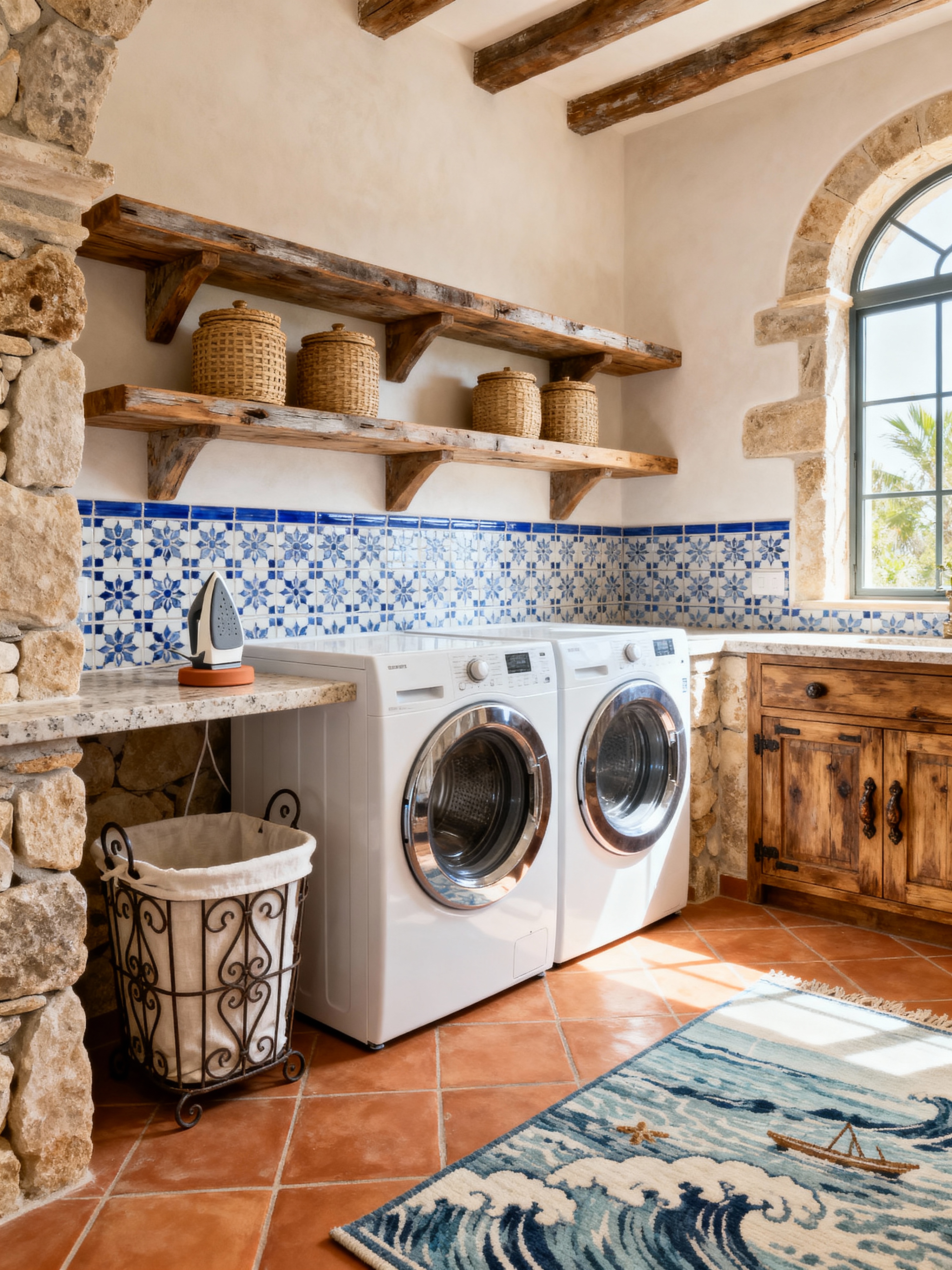 laundry room with mediterranean style with washing machine and floating shelves and clothes dryer and laundry jars and iron and area rug and clothes hamper and cabinet. . with stone accents and coastal influence and mosaic patterns and rustic charm and terracotta tiles and outdoor living and wrought iron and sun-drenched
