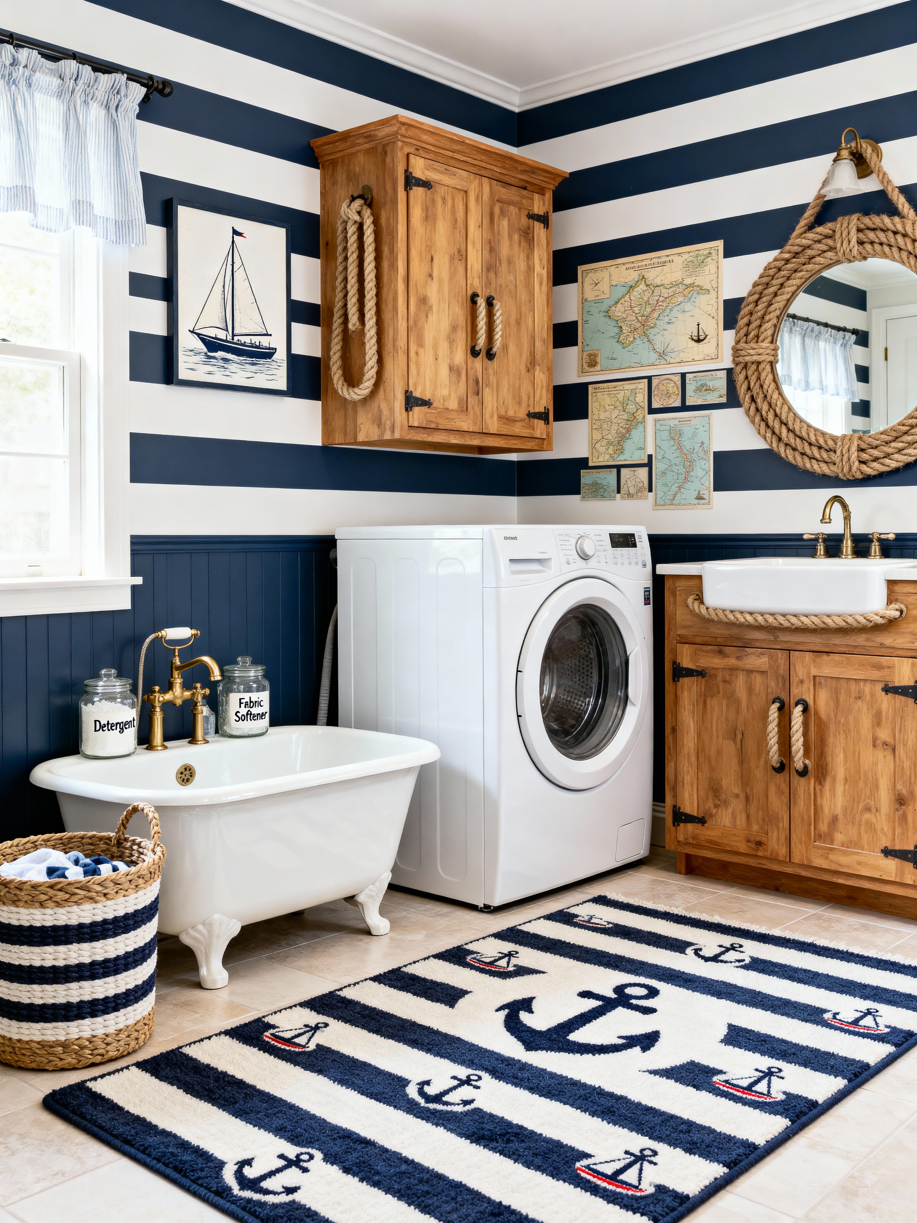 laundry room with nautical style with iron and laundry jars and area rug and washing machine and cabinet and laundry tub and clothes dryer and clothes hamper. . with rope details and navy blue and sailboat elements and anchor motifs and maritime decor and coastal vibes and seaside charm and striped patterns