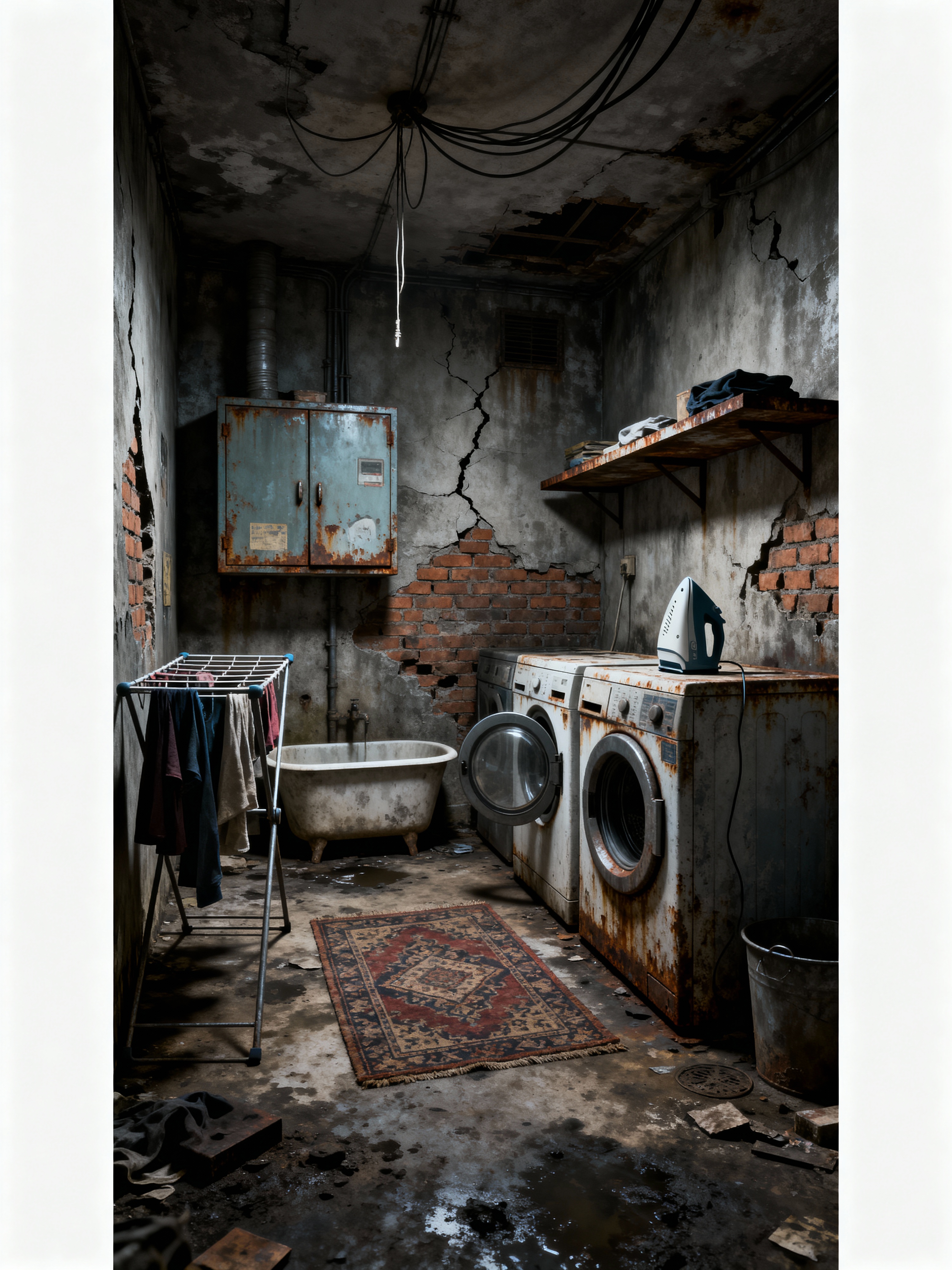 laundry room with post-apocalyptic style with floating shelves and clothes dryer and cabinet and iron and laundry tub and drying racks and area rug and washing machine. . with rusted metal and dim lighting and run-down favela style and exposed bricks and dystopian style and hanging exposed wires and dirty floor and cracked concrete walls