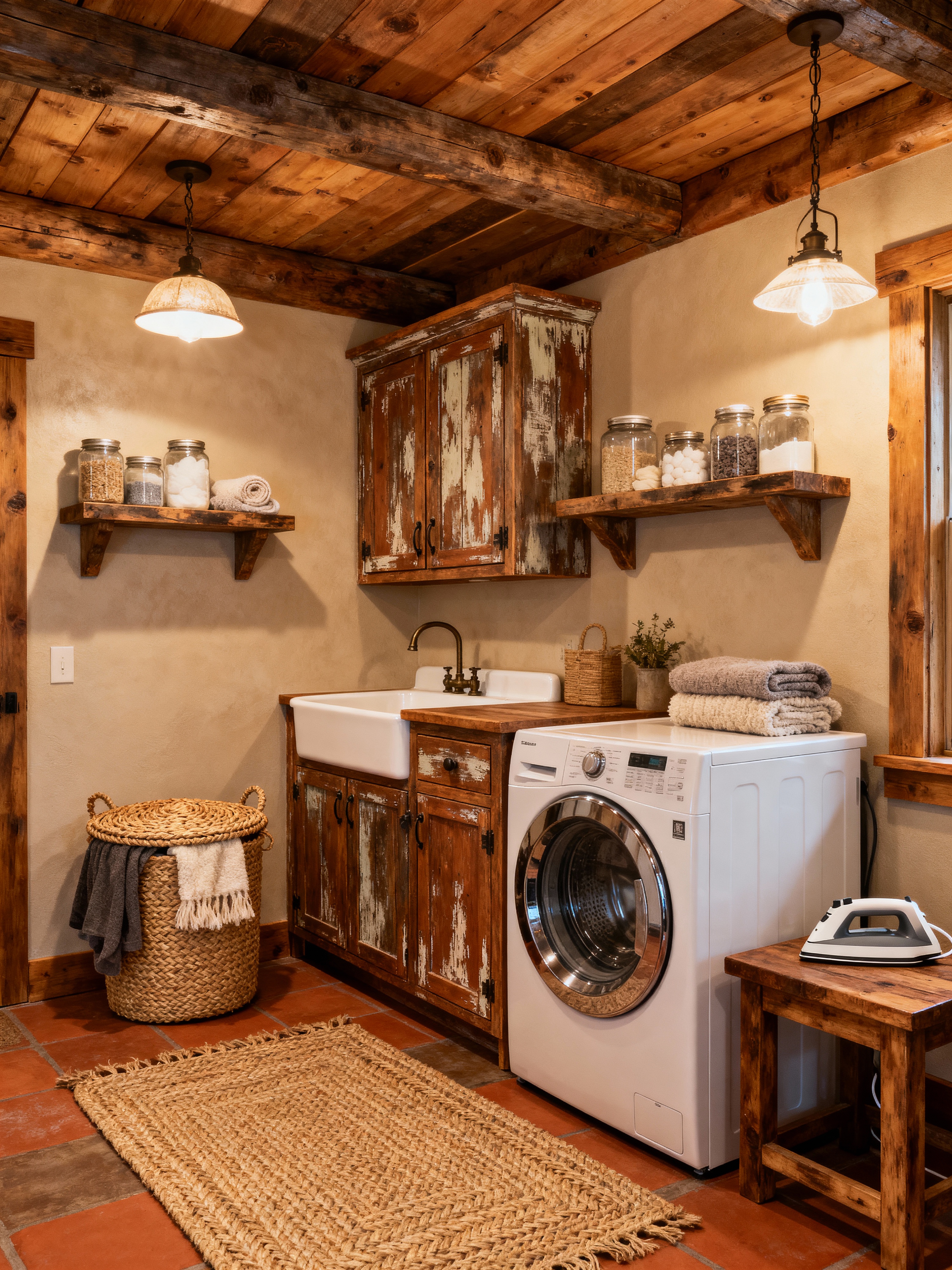 laundry room with rustic style with laundry jars and area rug and clothes hamper and cabinet and laundry tub and iron and floating shelves and washing machine. . with natural wood and earthy tones and woven textures and exposed beams and distressed finishes and warmth and iron fixtures and cozy cabin