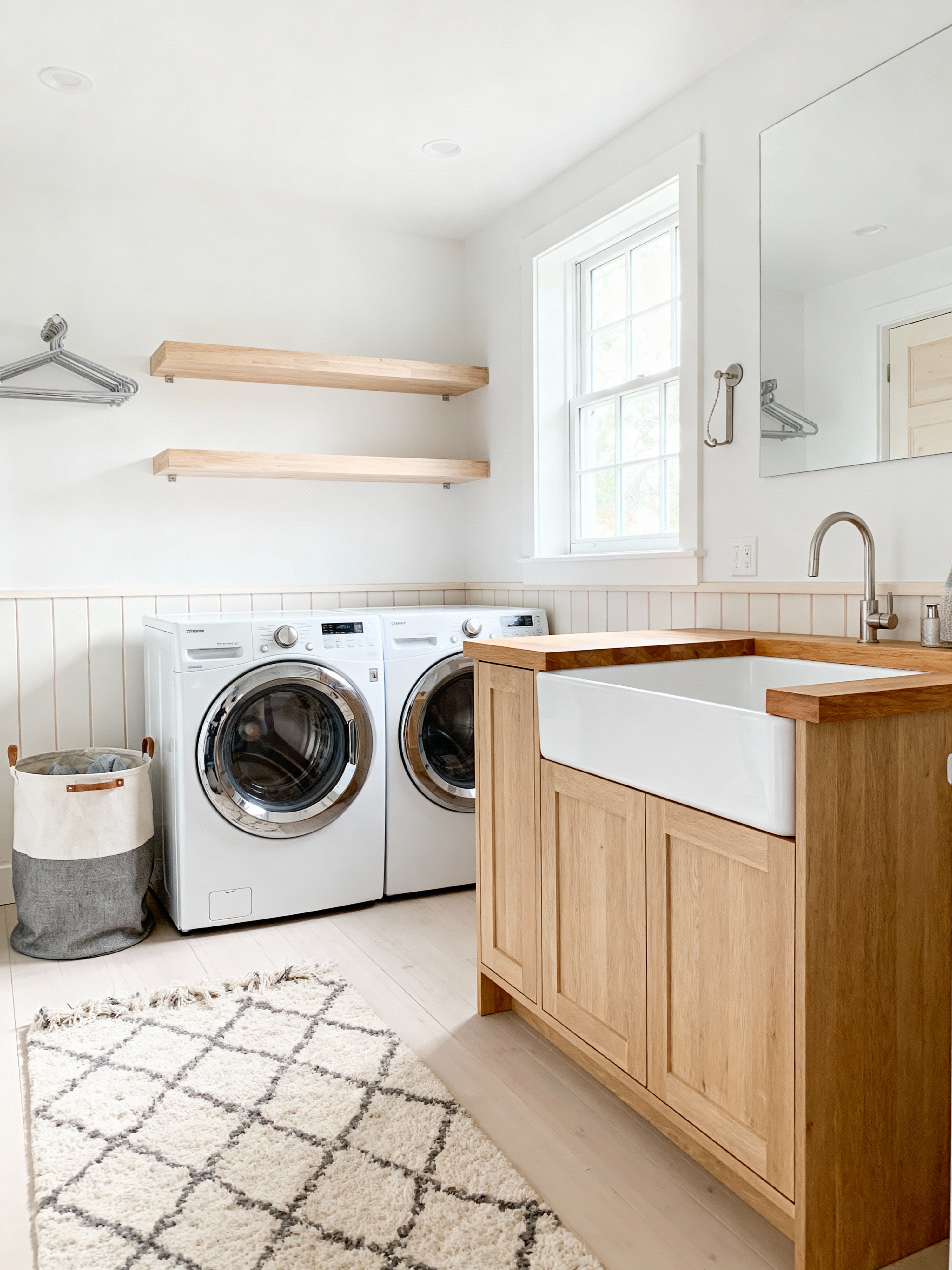 laundry room with scandinavian style with clothes dryer and cabinet and laundry tub and floating shelves and area rug and clothes hamper and washing machine and drying racks. . with natural light and cozy atmosphere and white decor and light wood and simple elegance and functional furniture and minimalist design and hygge