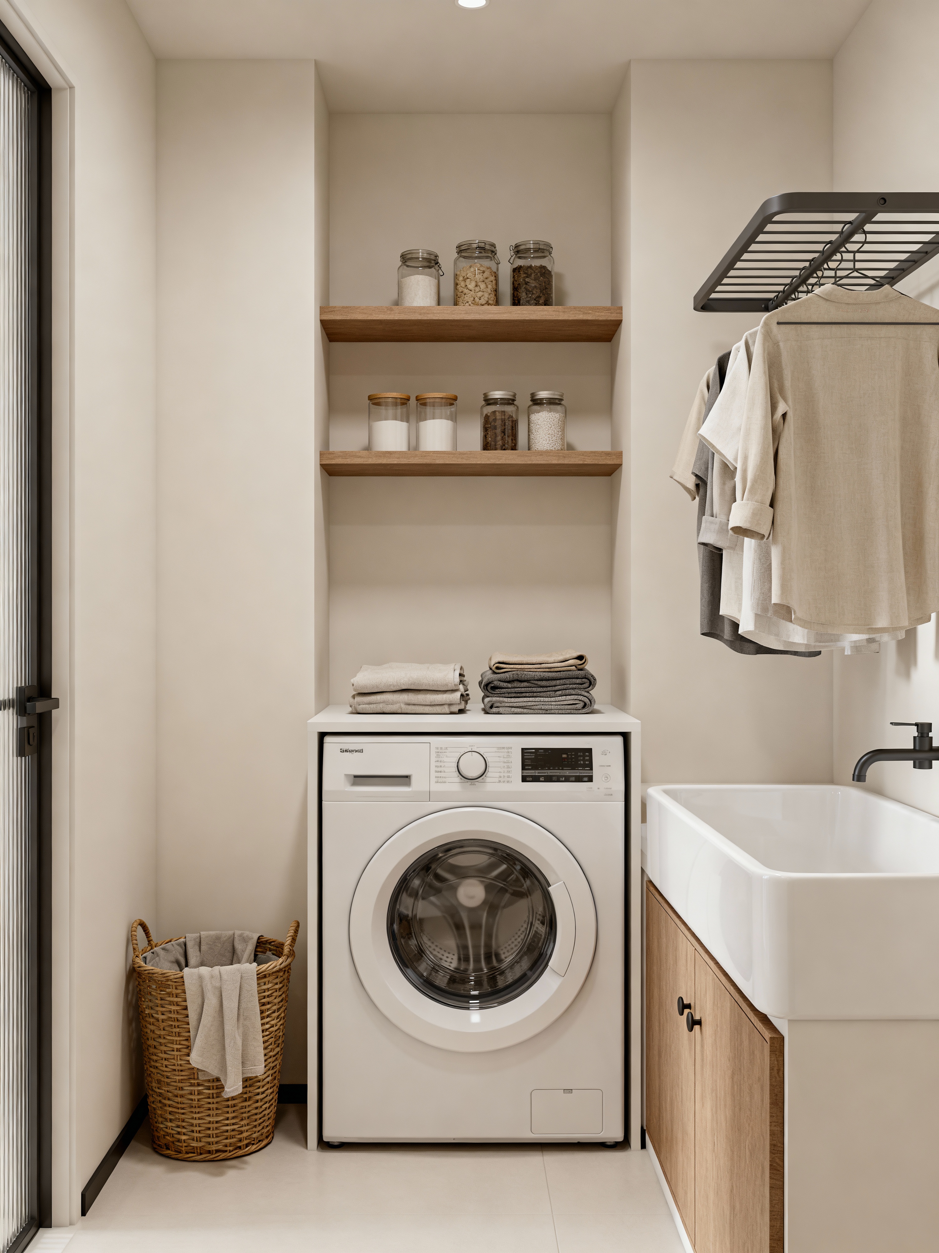laundry room with simple style with clothes dryer and clothes hamper and floating shelves and laundry tub and washing machine and drying racks and laundry jars and cabinet. . with neutral colors and uncluttered space and basic elements and calm atmosphere and functional furniture and minimal decor and essential pieces and understated style