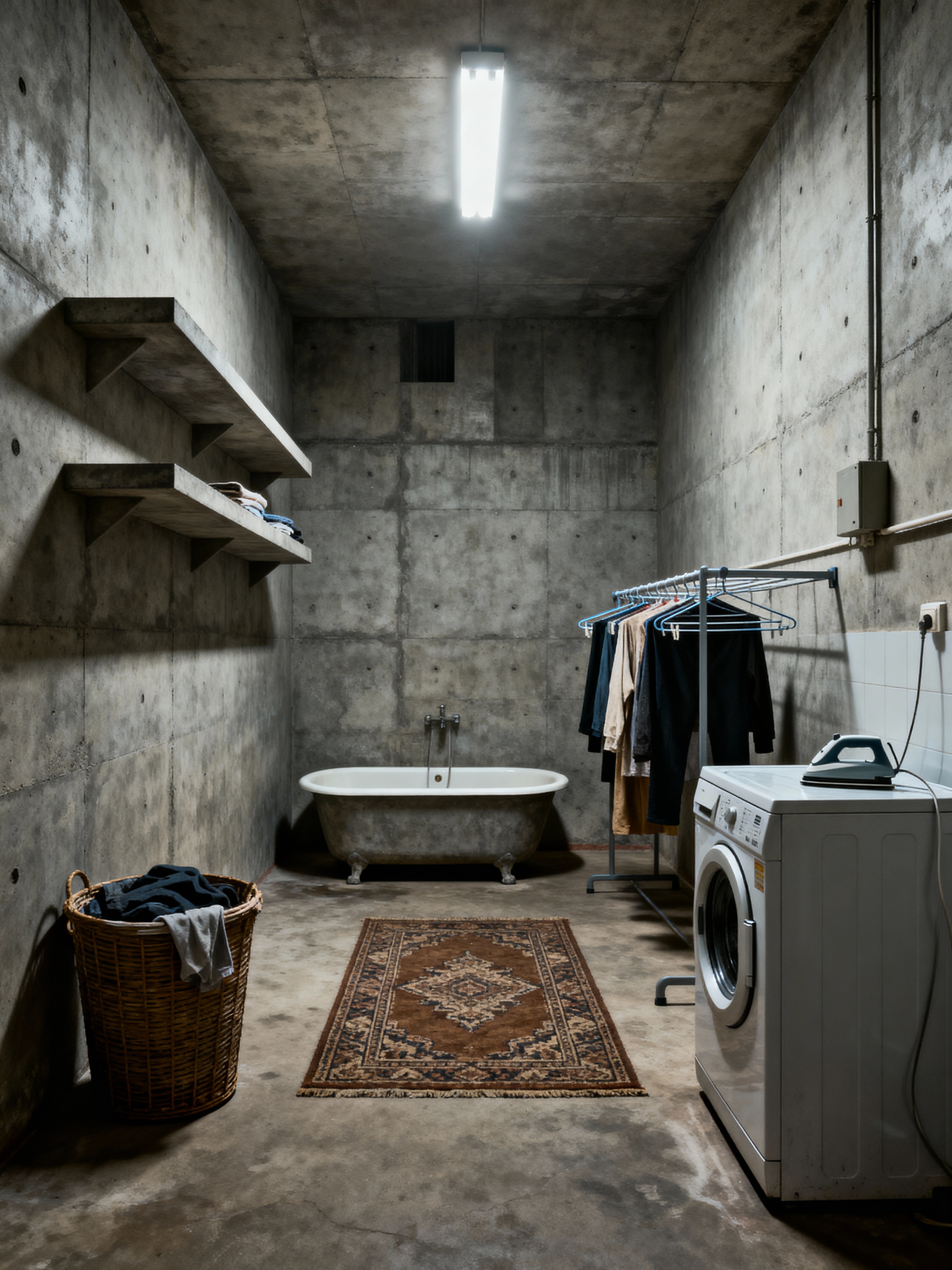 laundry room with soviet style with clothes hamper and floating shelves and area rug and laundry tub and clothes dryer and drying racks and washing machine and iron. . with socialist realism and soviet-era architecture and institutional look and concrete structures and eastern bloc and utilitarian design and brutalist style and monumental scale