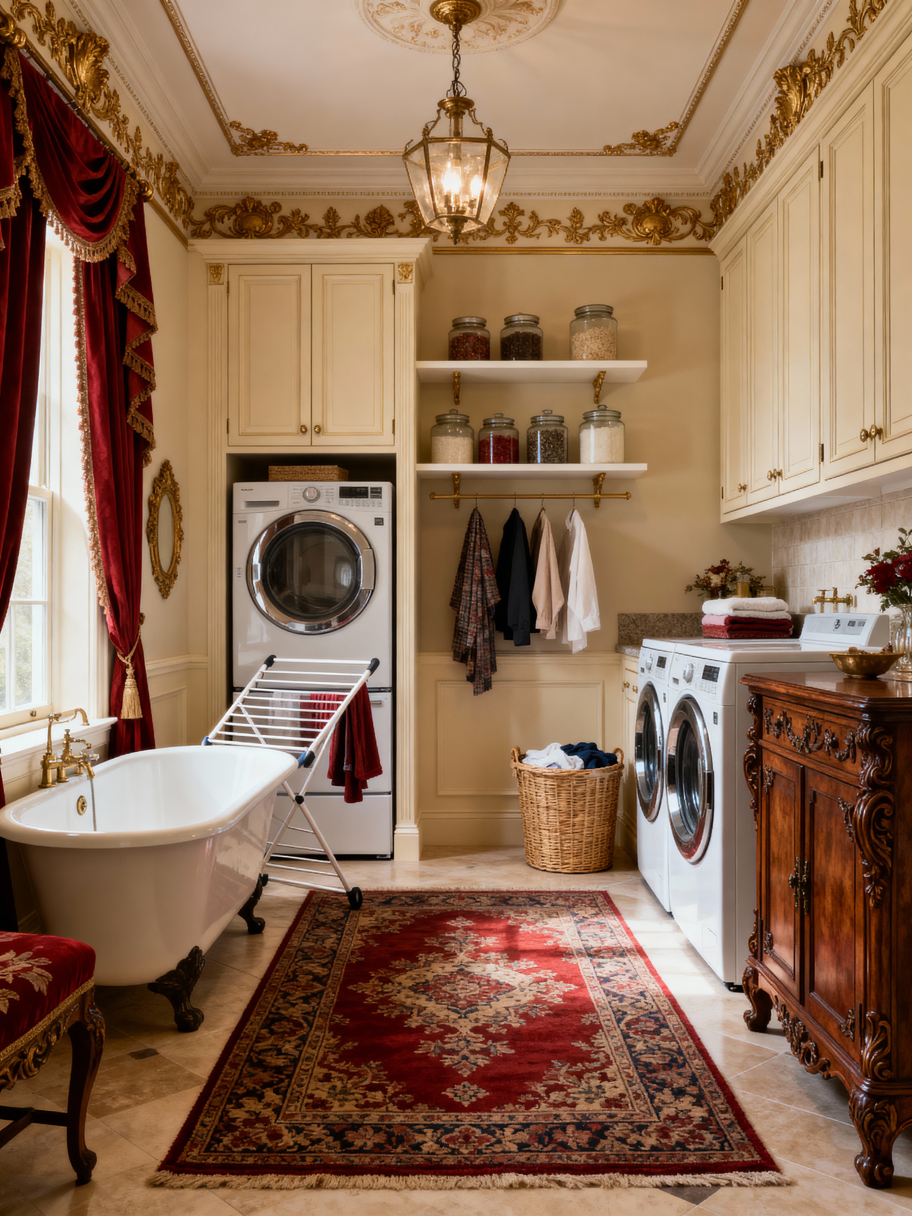 laundry room with traditional style with drying racks and clothes dryer and floating shelves and area rug and laundry tub and washing machine and laundry jars and clothes hamper. . with classic elegance and ornate details and timeless design and rich fabrics and symmetrical layout and warm colors and antique pieces and formal furniture