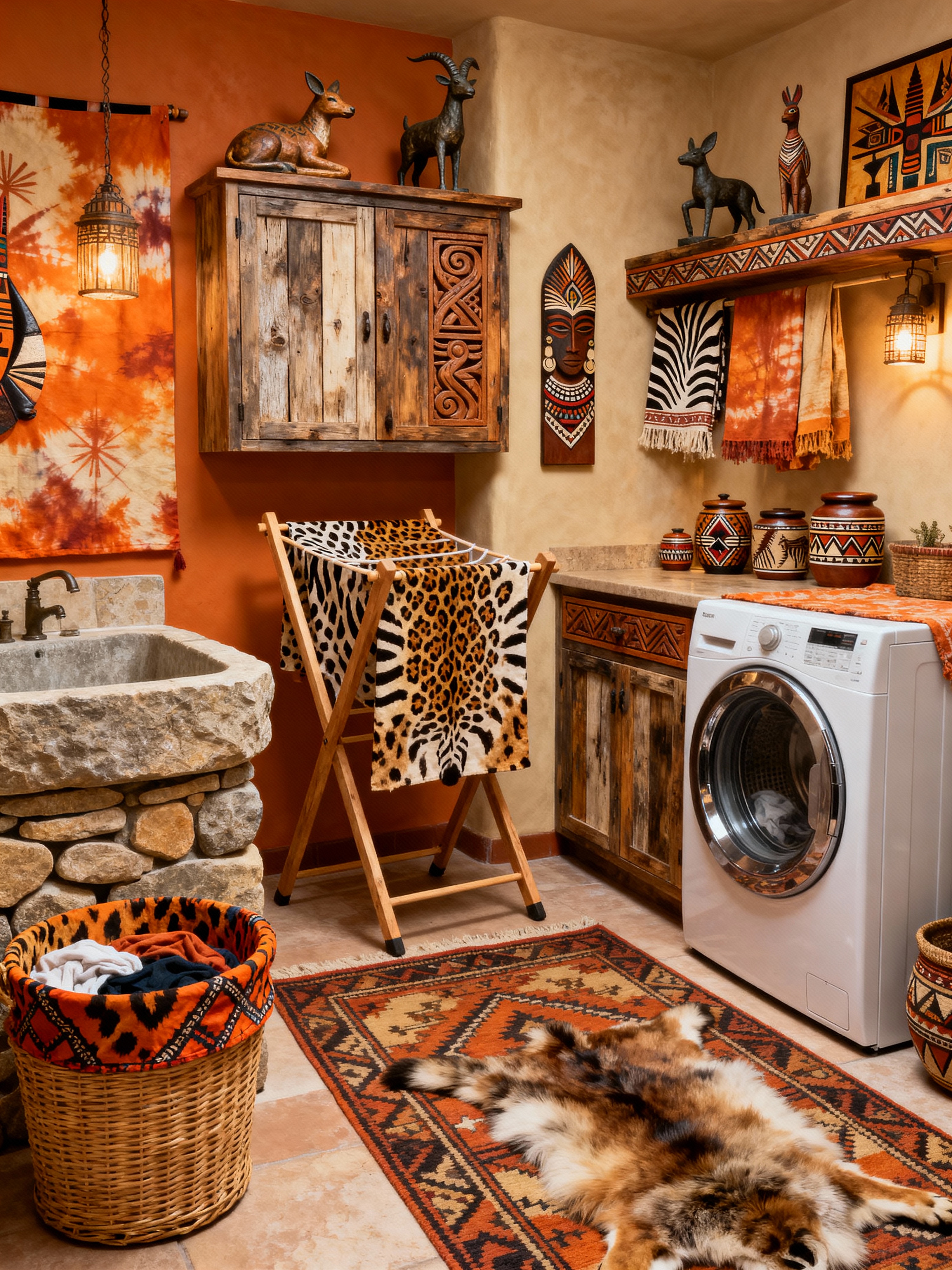 laundry room with tribal style with cabinet and iron and area rug and laundry tub and clothes hamper and drying racks and clothes dryer and laundry jars. . with exuberant splashes of colour and hand dyed batik fabrics and animal prints and planks of stone and desert colours and sculptures and artworks and smooth worn timbers and animal furslinen