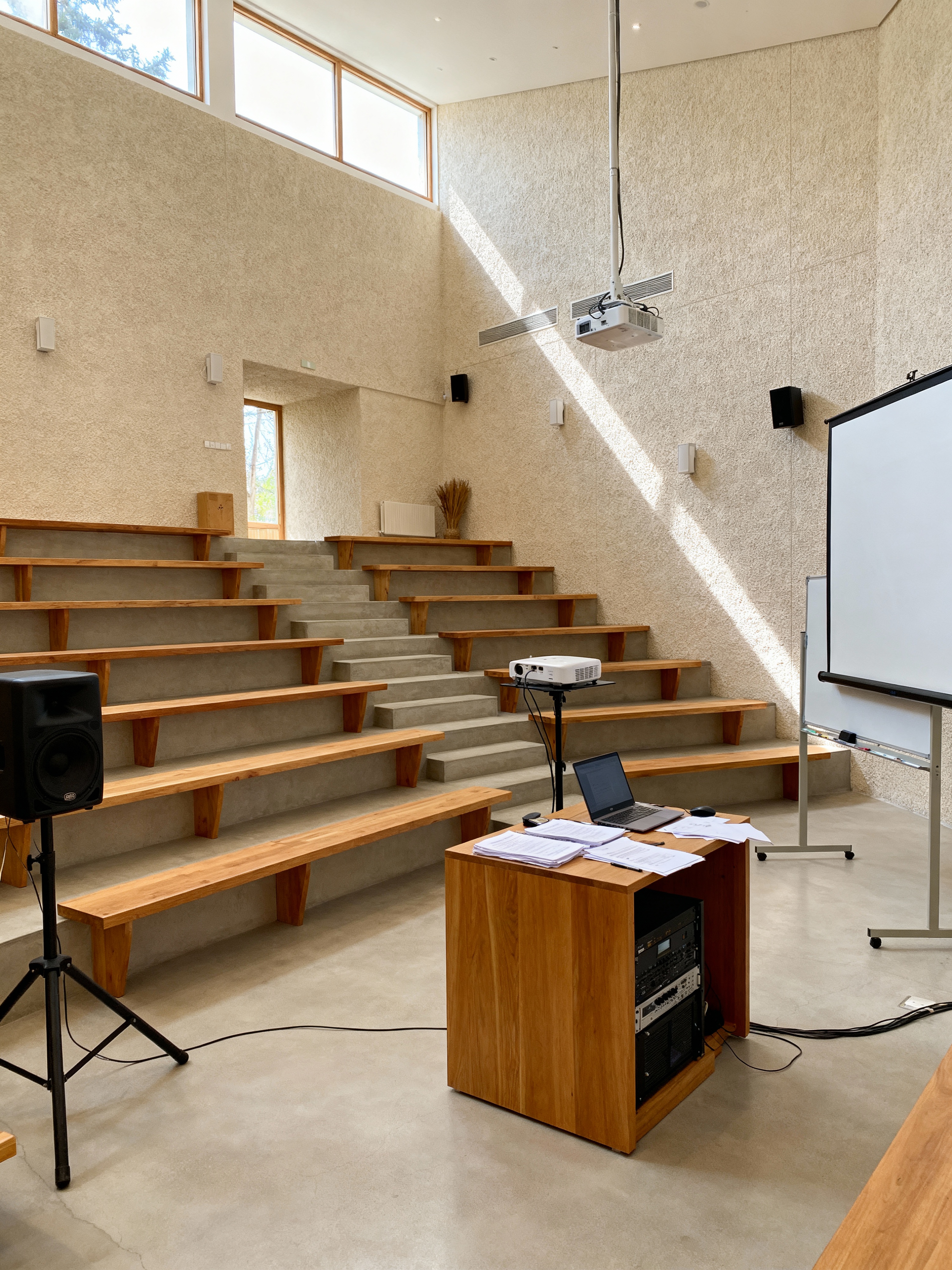 lecture hall with airbnb style with lecture notes and tiered seating and projector and speaker system and laptop and whiteboard and podium and projection screen. . with neutral walls and textures and scandinavian style and open and natural lighting and simple color palette and simple, clean lines and simplistic furniture and practicality and functionality and natural materials and elements and neutral walls and textures