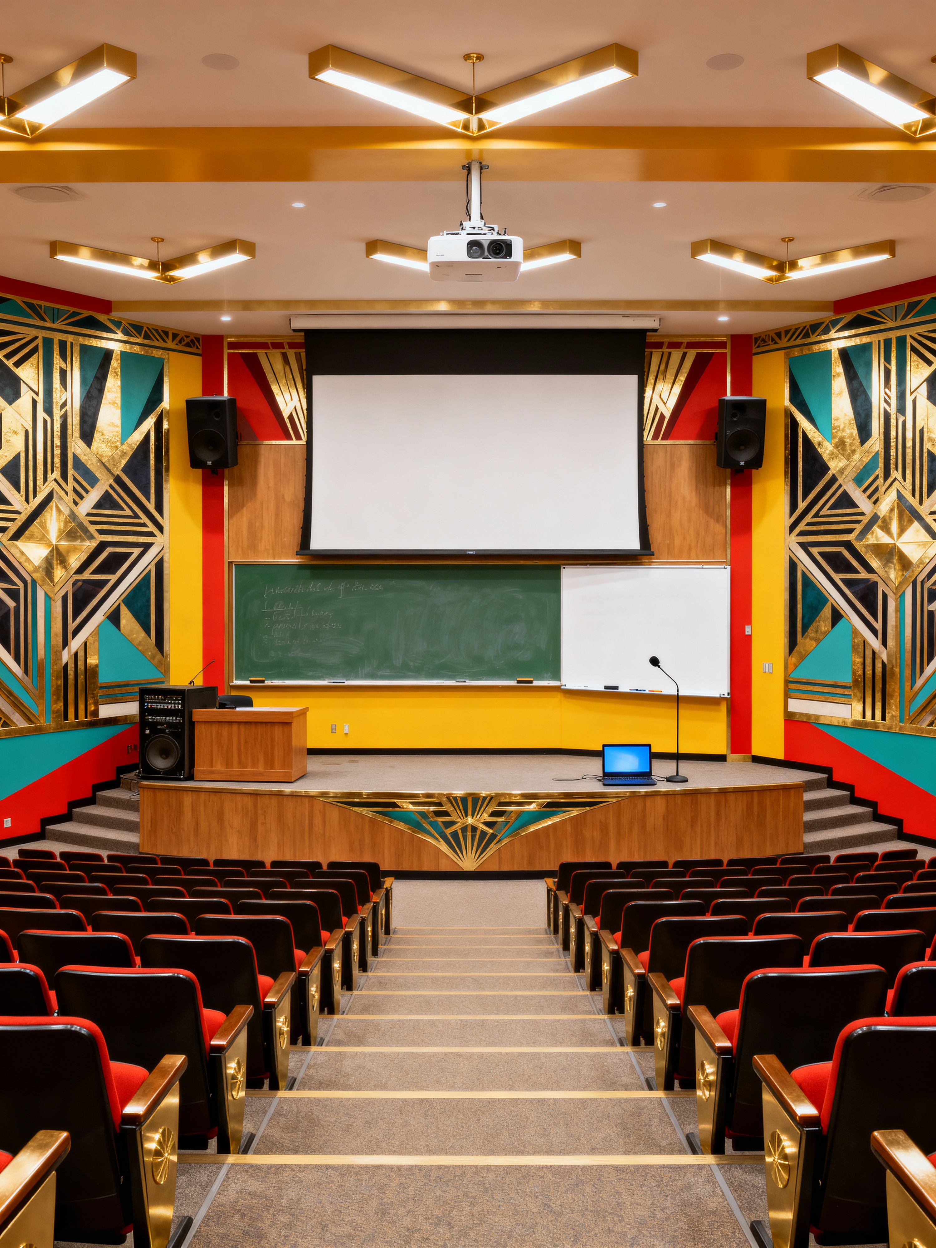 lecture hall with art deco style with projector and speaker system and microphone and chalkboard and laptop and tiered seating and whiteboard and projection screen. . with angular shapes and abstract patterns and luxury and bright and cheerful colors and symmetrical designs and stream-lined forms and exuberant shapes and decadent detail