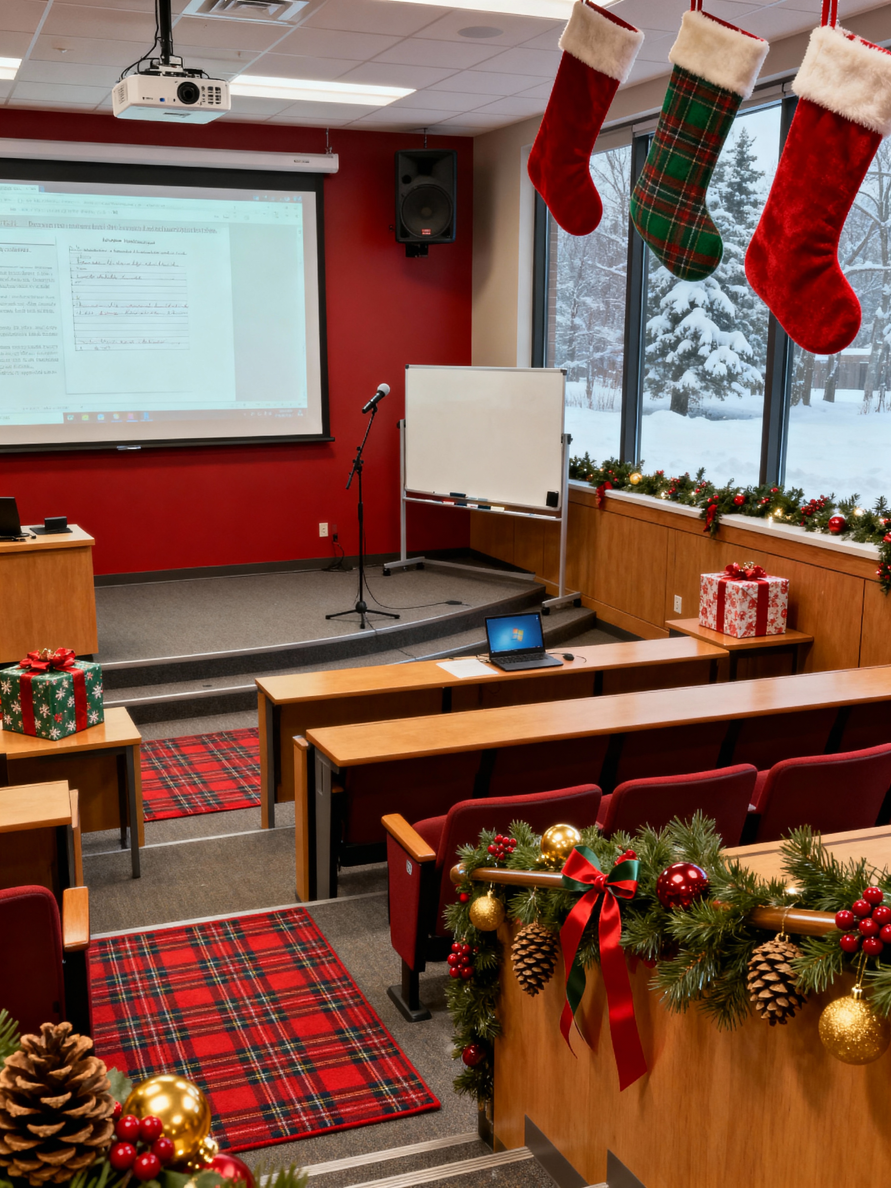lecture hall with christmas style with projection screen and lecture notes and projector and speaker system and tiered seating and whiteboard and microphone and laptop. . with snow outside and giftwrapped gifts and a few big socks hanging and plaid rugs and tie pinecones and berries and christmas ornaments and ribbons and berries and greenery draped