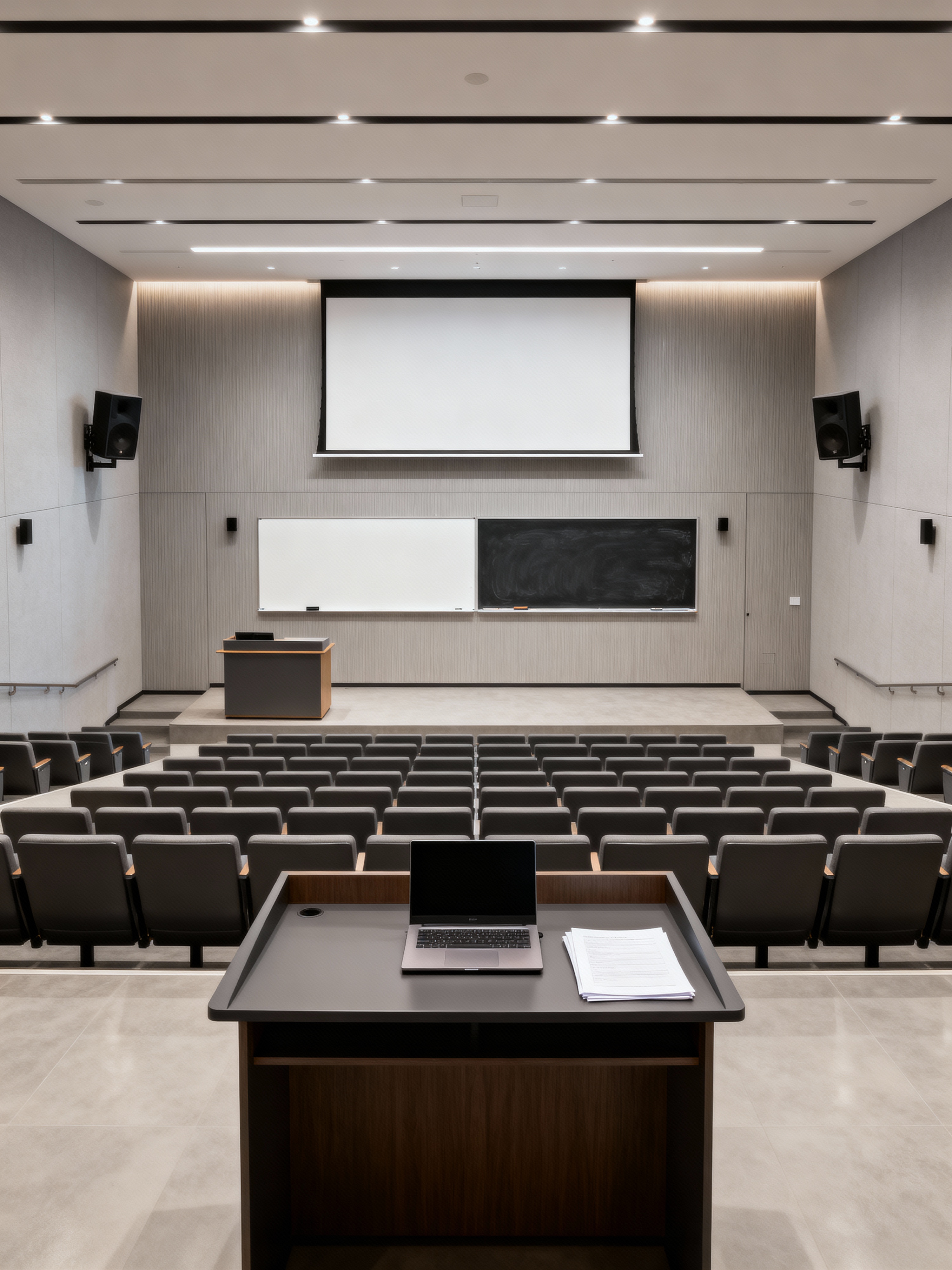 lecture hall with contemporary style with tiered seating and podium and laptop and speaker system and whiteboard and projection screen and chalkboard and lecture notes. . with minimalist and elegant simplicity and metal accents and clean look and functional design and open spaces and neutral palette and sleek lines