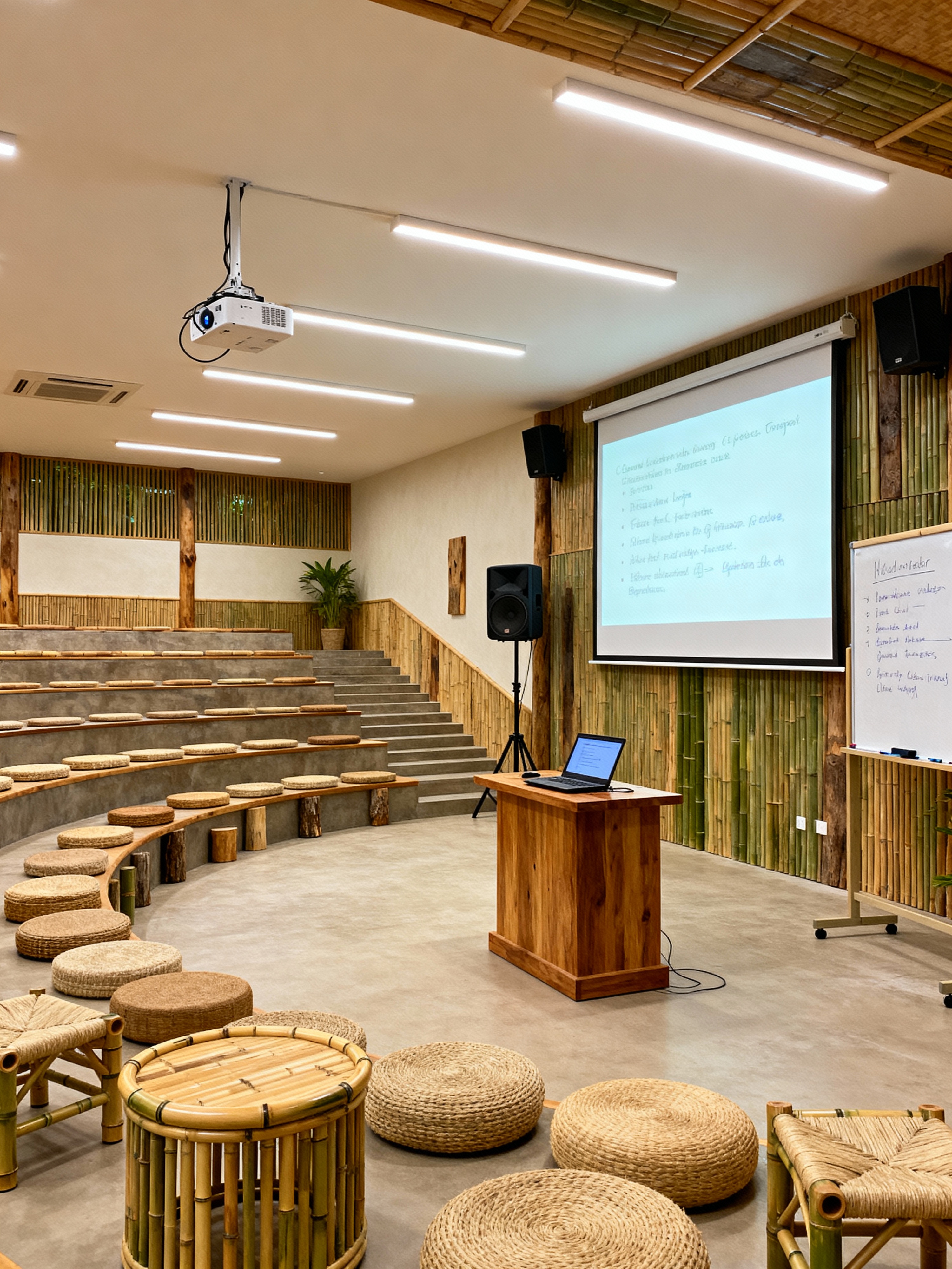 lecture hall with eco-friendly style with whiteboard and lecture notes and tiered seating and podium and laptop and projector and projection screen and speaker system. . with green living and natural fibers and recycled elements and reclaimed wood and environmentally conscious and renewable resources and energy efficient and bamboo furniture