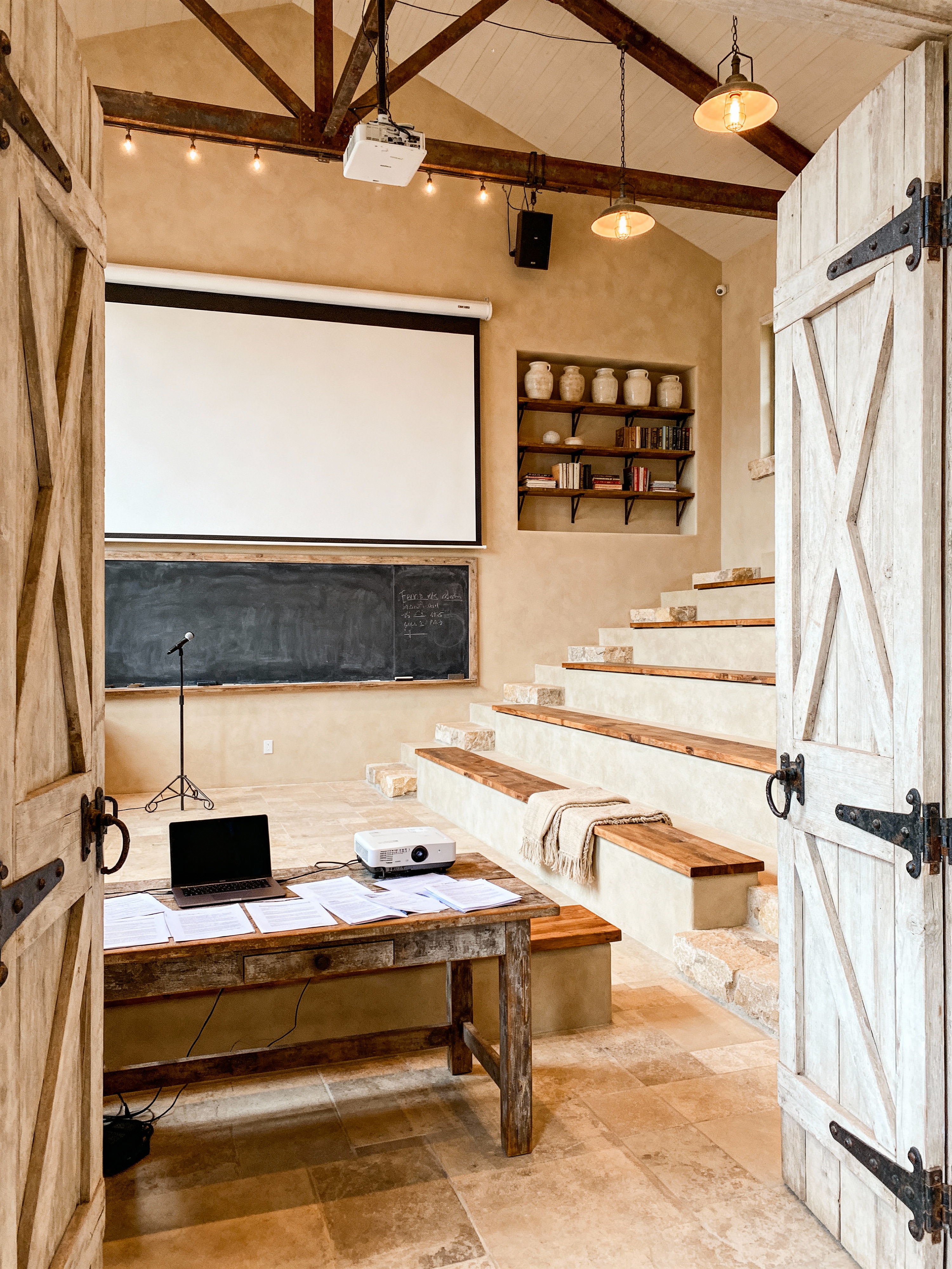 lecture hall with farmhouse style with whiteboard and tiered seating and chalkboard and lecture notes and laptop and projection screen and projector and microphone. . with rustic charm and natural textures and country style and barn doors and neutral tones and cozy feel and industrial accents and open shelving