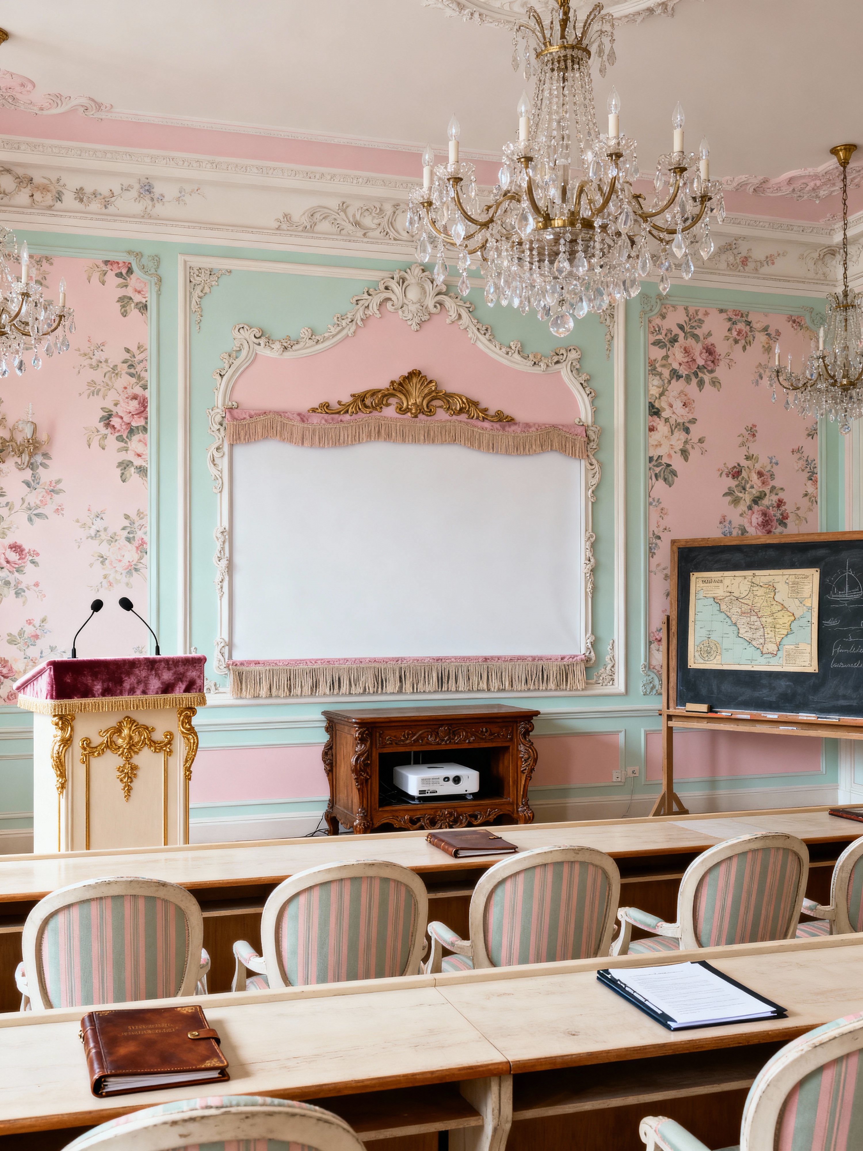 lecture hall with french style with podium and whiteboard and microphone and projection screen and projector and tiered seating and chalkboard and lecture notes. . with provincial charm and soft pastels and antique pieces and sophisticated grace and crystal accents and elegant details and ornate furniture and romantic style