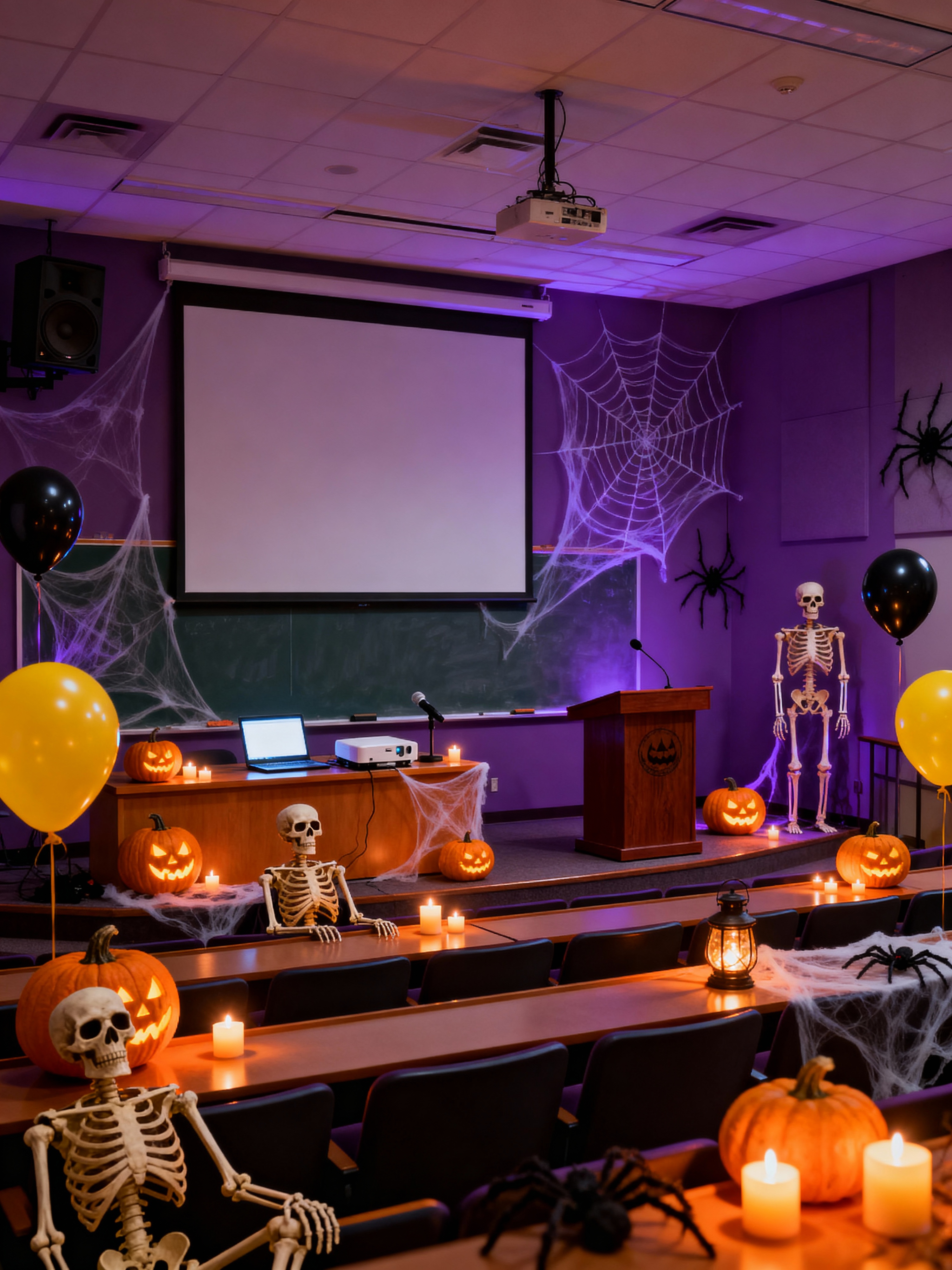 lecture hall with halloween style with speaker system and projection screen and tiered seating and laptop and chalkboard and projector and microphone and podium. . with glowing pumpkins and human skulls and cobwebs and spiderwebs and cobwebs and skeletons sitting and standing and lanterns and yellow black balloons