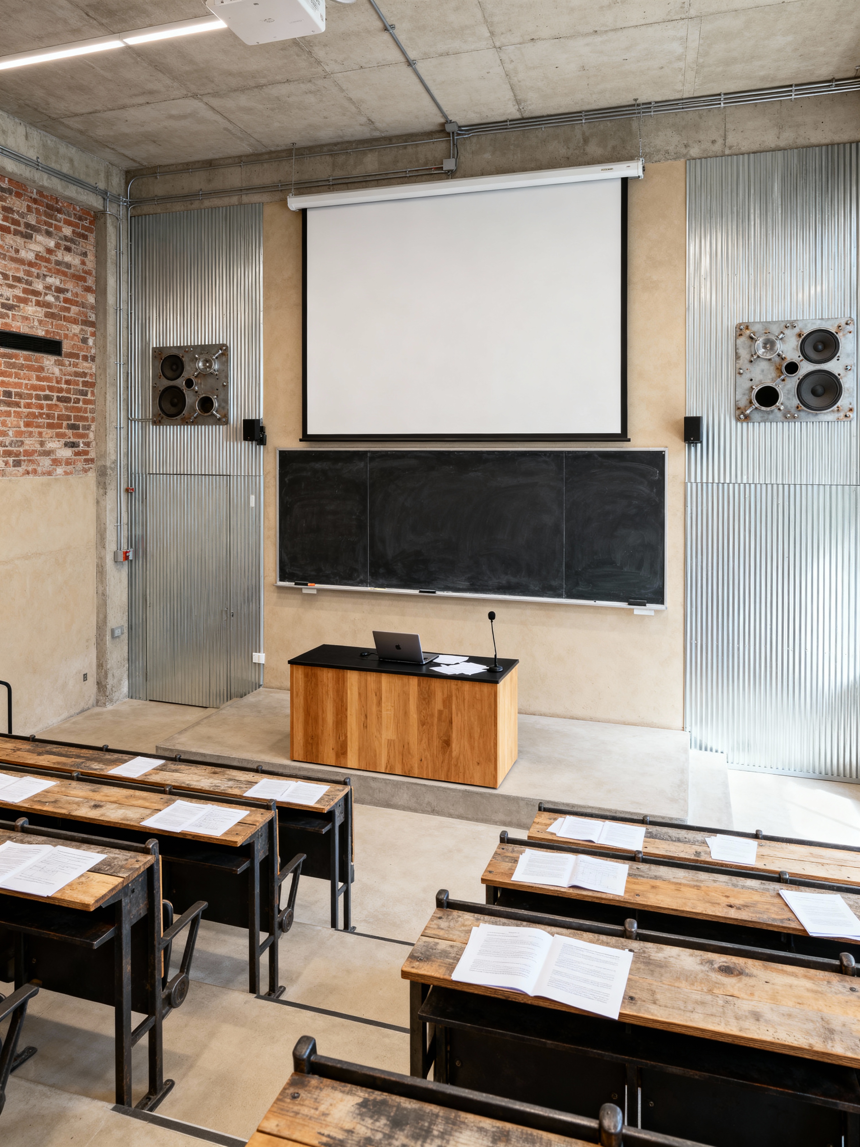 lecture hall with industrial style with chalkboard and laptop and tiered seating and podium and lecture notes and speaker system and projection screen and microphone. . with factory style and neutral tones and reclaimed wood and exposed concrete and exposed brick and raw aesthetic and open floorplan and metal panels