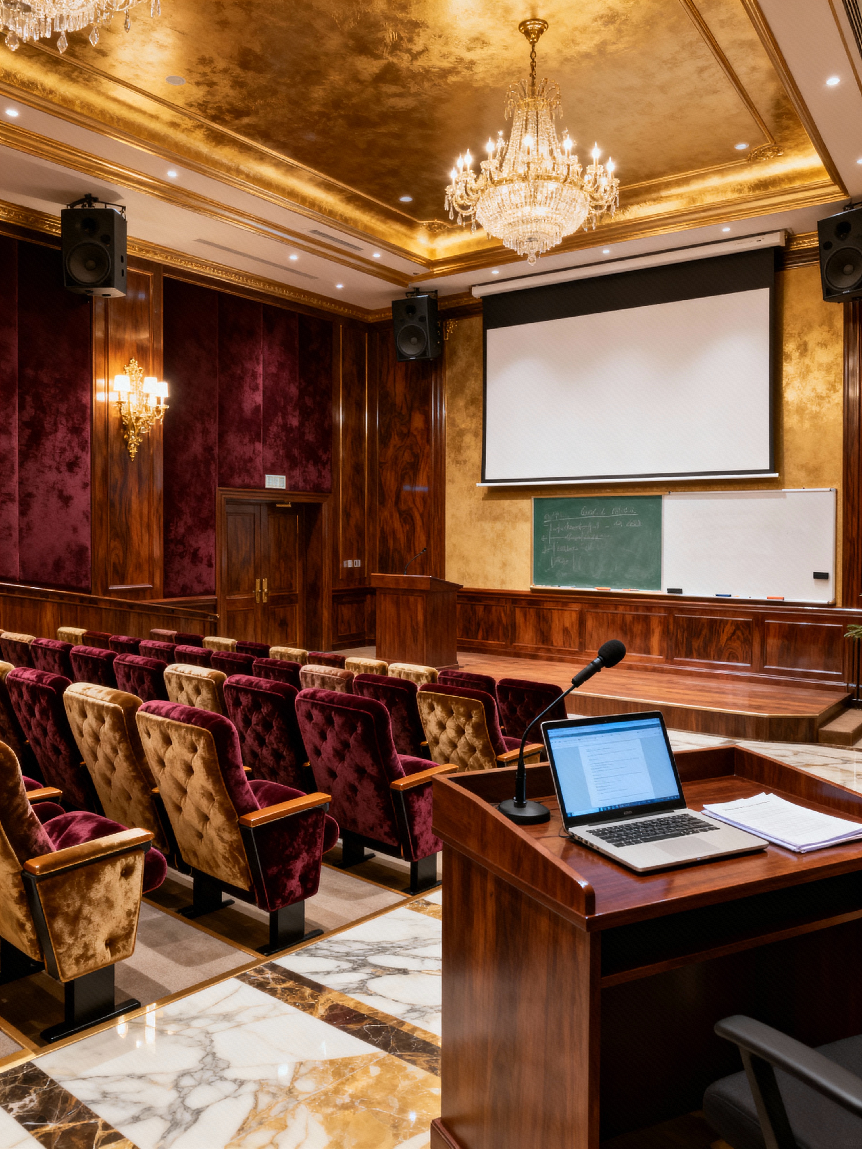 lecture hall with luxury style with tiered seating and whiteboard and chalkboard and microphone and projection screen and laptop and lecture notes and speaker system. . with exclusive design and premium finishes and lavish comfort and high-end materials and expensive fabrics and custom pieces and elegant lighting and rich textures