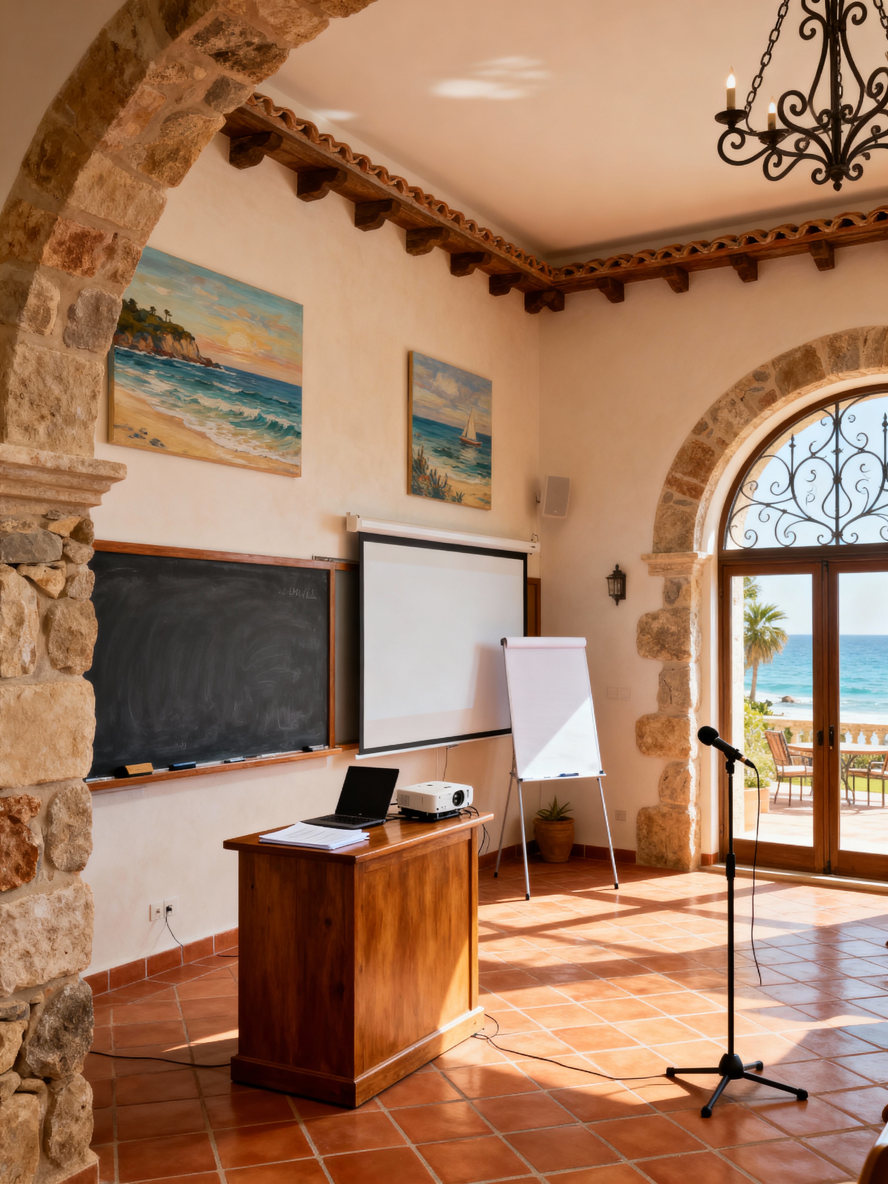 lecture hall with mediterranean style with chalkboard and laptop and podium and lecture notes and whiteboard and projection screen and projector and microphone. . with arched doorways and outdoor living and wrought iron and sun-drenched and terracotta tiles and stone accents and rustic charm and coastal influence