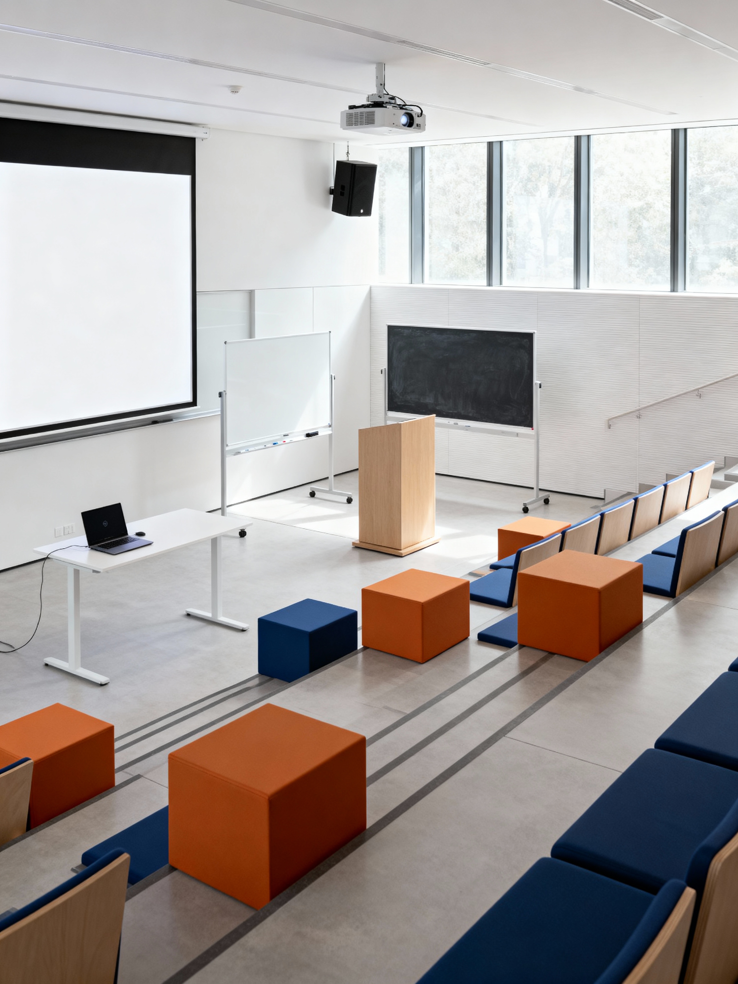 lecture hall with minimalist style with projection screen and laptop and whiteboard and podium and projector and tiered seating and chalkboard and speaker system. . with clean lines and lots of light and an open floor plan and a monochromatic palette with colour used as an accent and focus on the shape, colour and texture of just a few of essential elements and functional furniture and clean lines