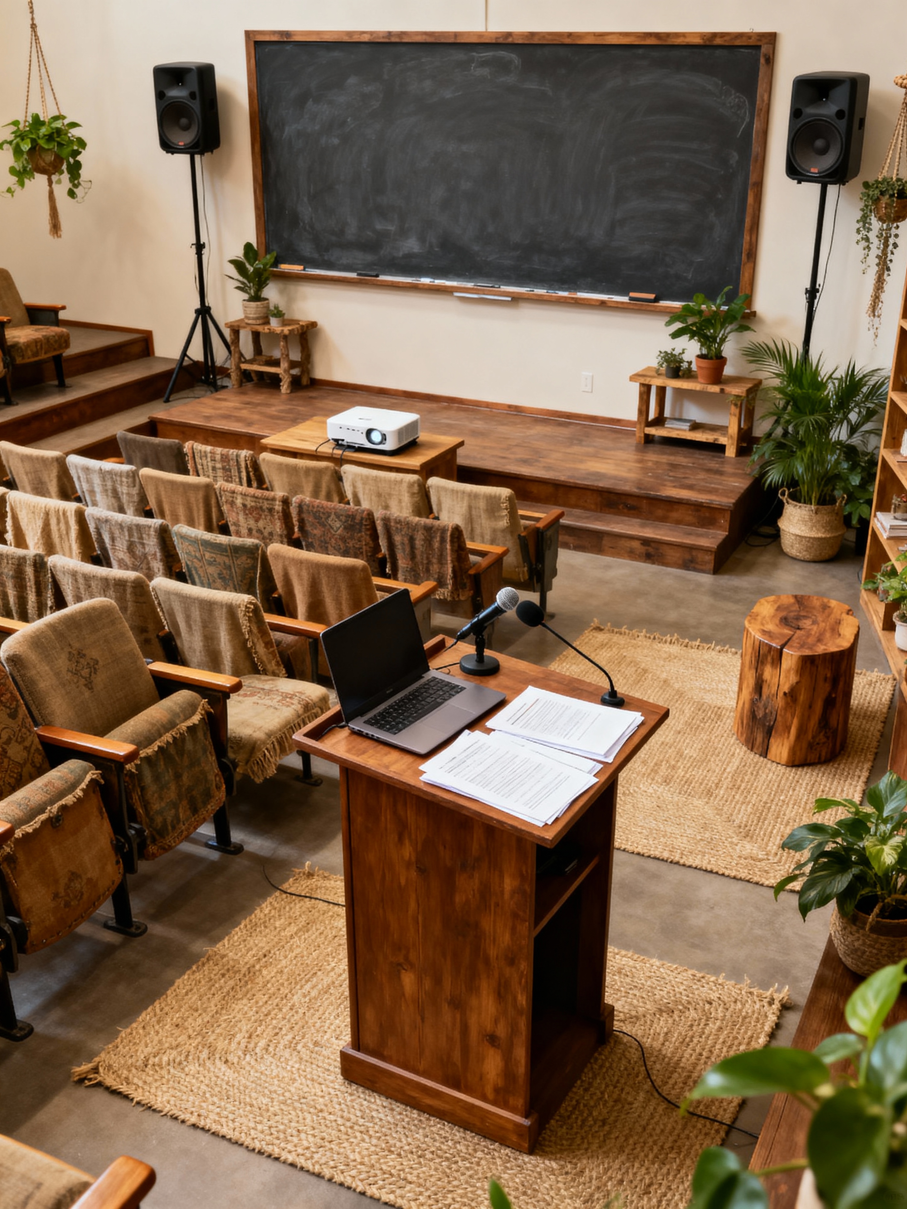 lecture hall with modern boho style with chalkboard and podium and projector and laptop and tiered seating and speaker system and lecture notes and microphone. . with minimalist and collected look and vintage furniture and jute rugs and cozy feel and layered textures and wood decor and plants