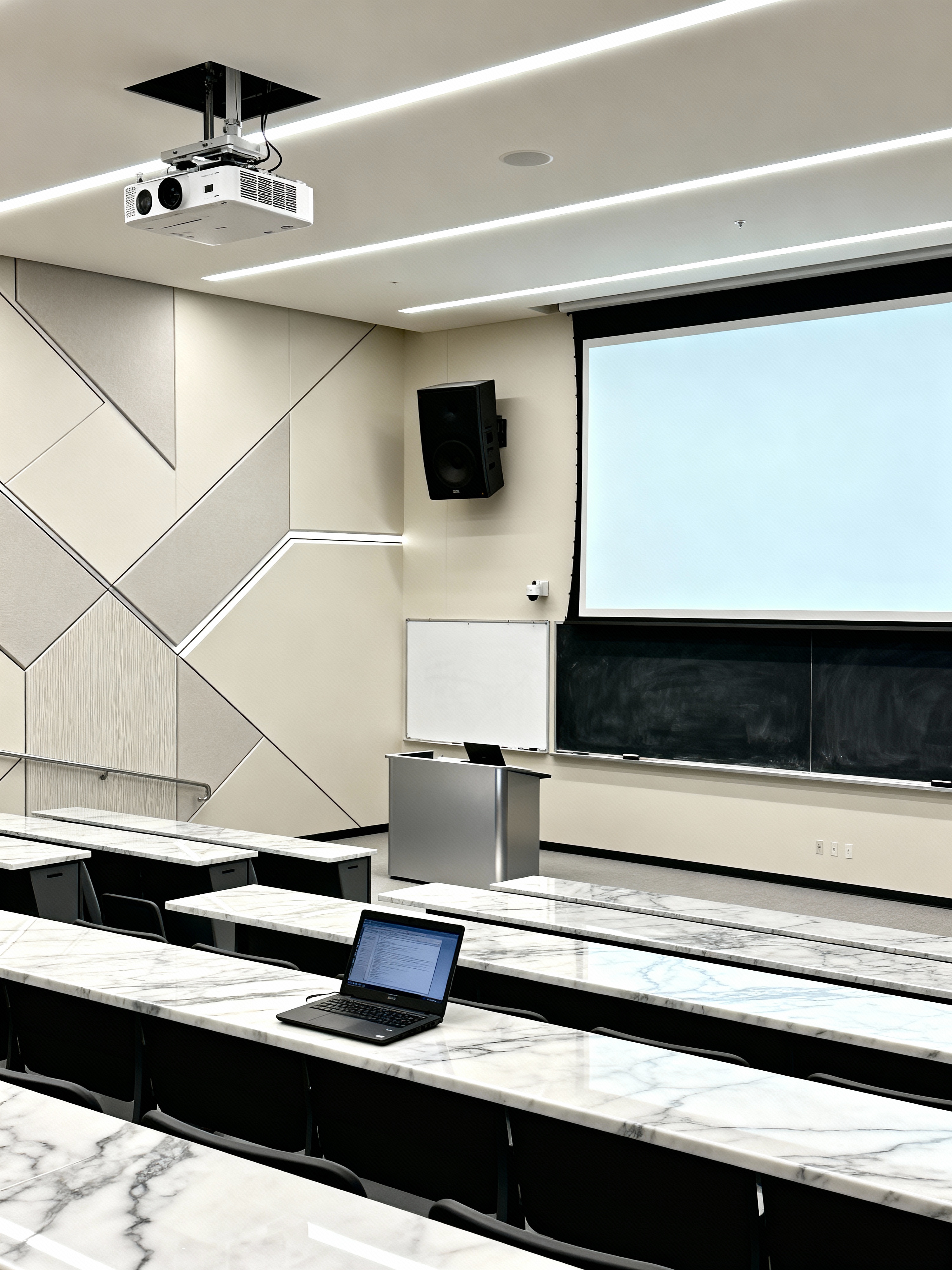 lecture hall with retro futuristic style with projector and speaker system and podium and whiteboard and chalkboard and projection screen and laptop and tiered seating. . with light colors and steel finishing and neutral background and bright accents and floating surfaces and futurism minimalist interior and smooth polished marble and strong geometric walls and monochromatic palette