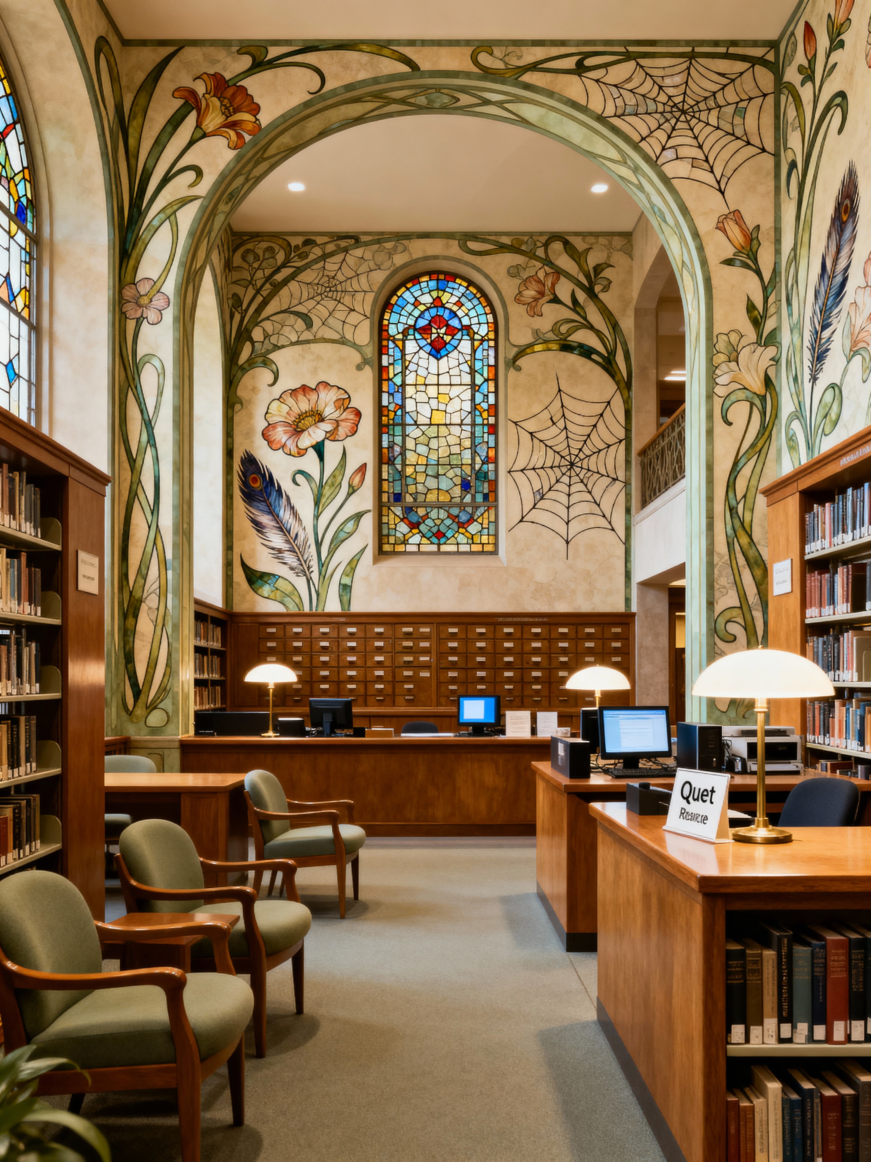 library with art nouveau style with chairs and bookshelves and card catalogs and computer terminals and study lamps and quiet signs and checkout desk and reference books. . with wallpaper patterns of stylized flowers and stained glass and wallpaper patterns of feathers and soft, rounded lines and arches and curved forms and wallpaper pattners of spider webs and mosaics and curving, plant-like embellishments