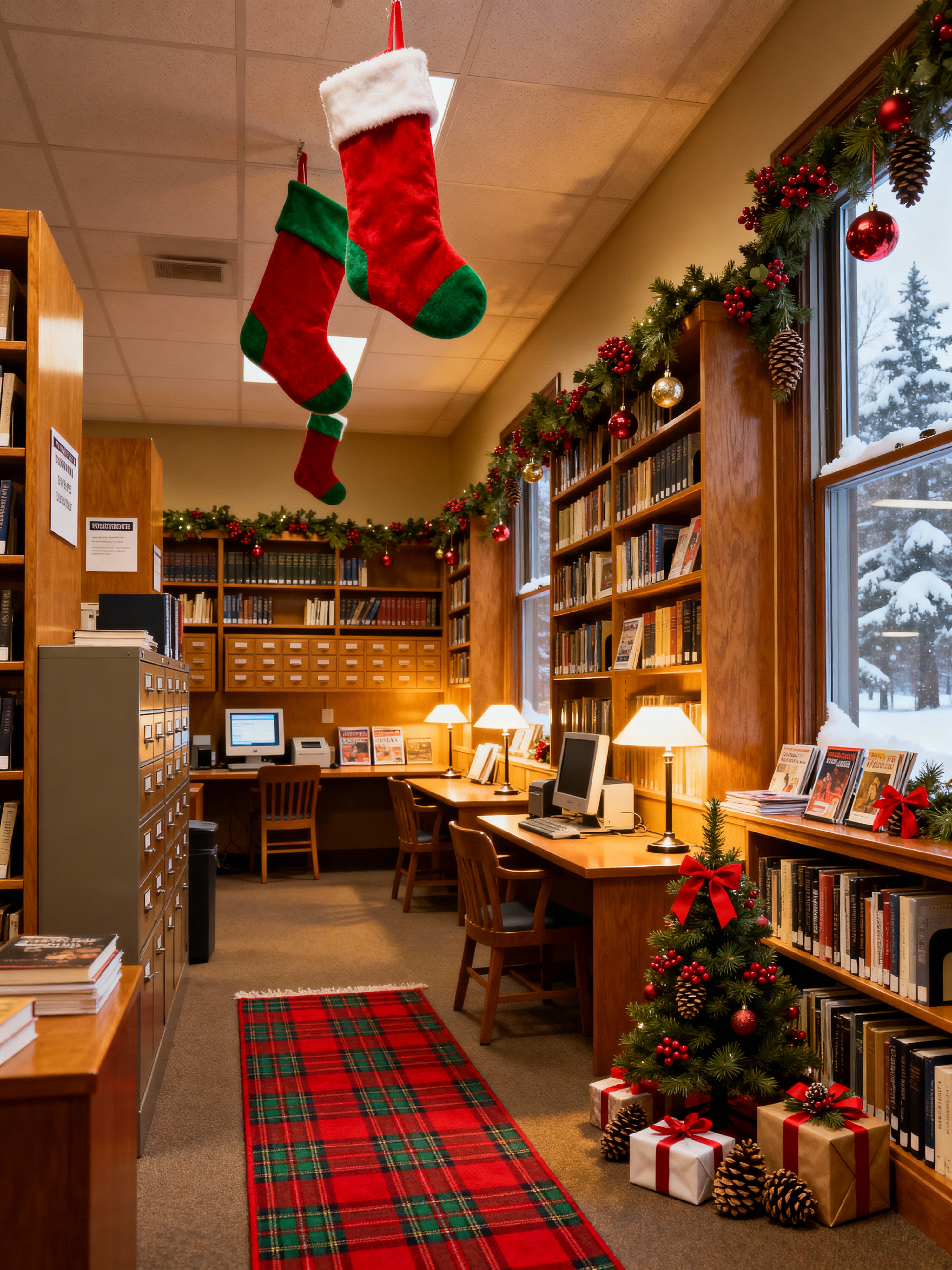 library with christmas style with card catalogs and computer terminals and reference books and quiet signs and periodicals and bookshelves and study lamps and reading tables. . with berries and greenery draped and giftwrapped gifts and tie pinecones and berries and a few big socks hanging and snow outside and ribbons and plaid rugs and christmas ornaments