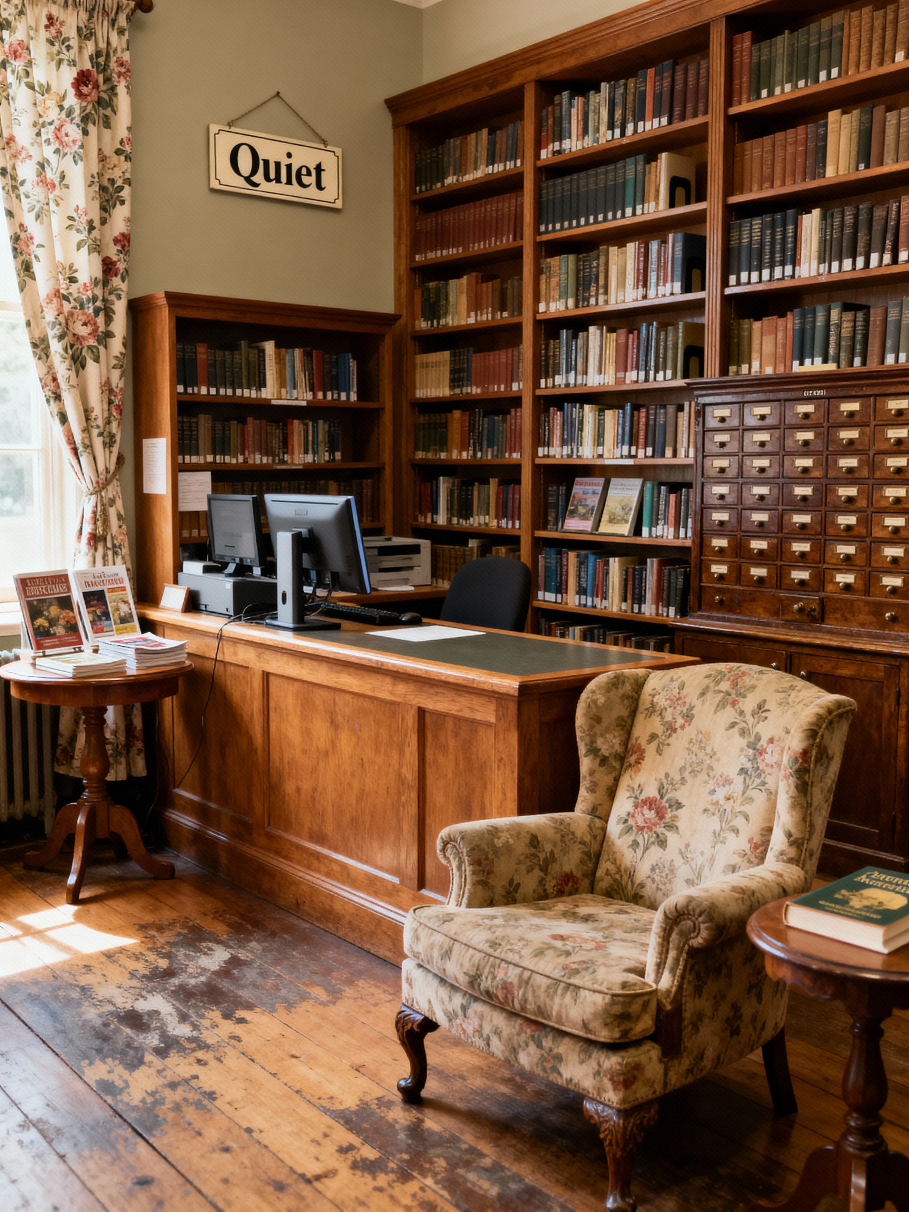 library with cottagecore style with checkout desk and chairs and computer terminals and bookshelves and periodicals and reference books and quiet signs and card catalogs. . with earthy and natural and floral patterns and country style and cottage style and traditional and organic and rustic