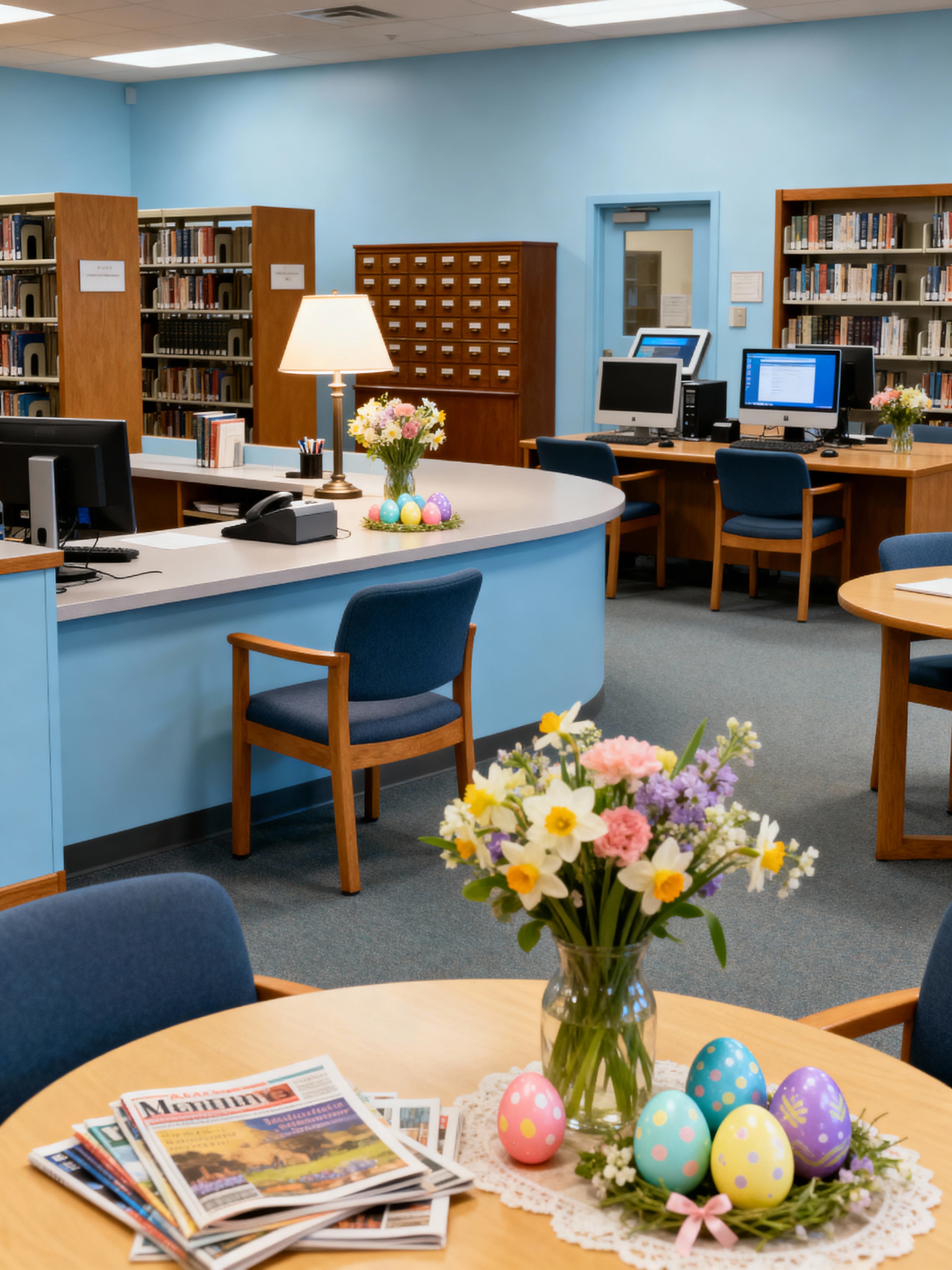library with easter style with checkout desk and periodicals and reference books and chairs and study lamps and card catalogs and bookshelves and computer terminals. . with spring decorations and light blue colors and easter decorations and flowers on table and colorful easter eggs and spring decorations