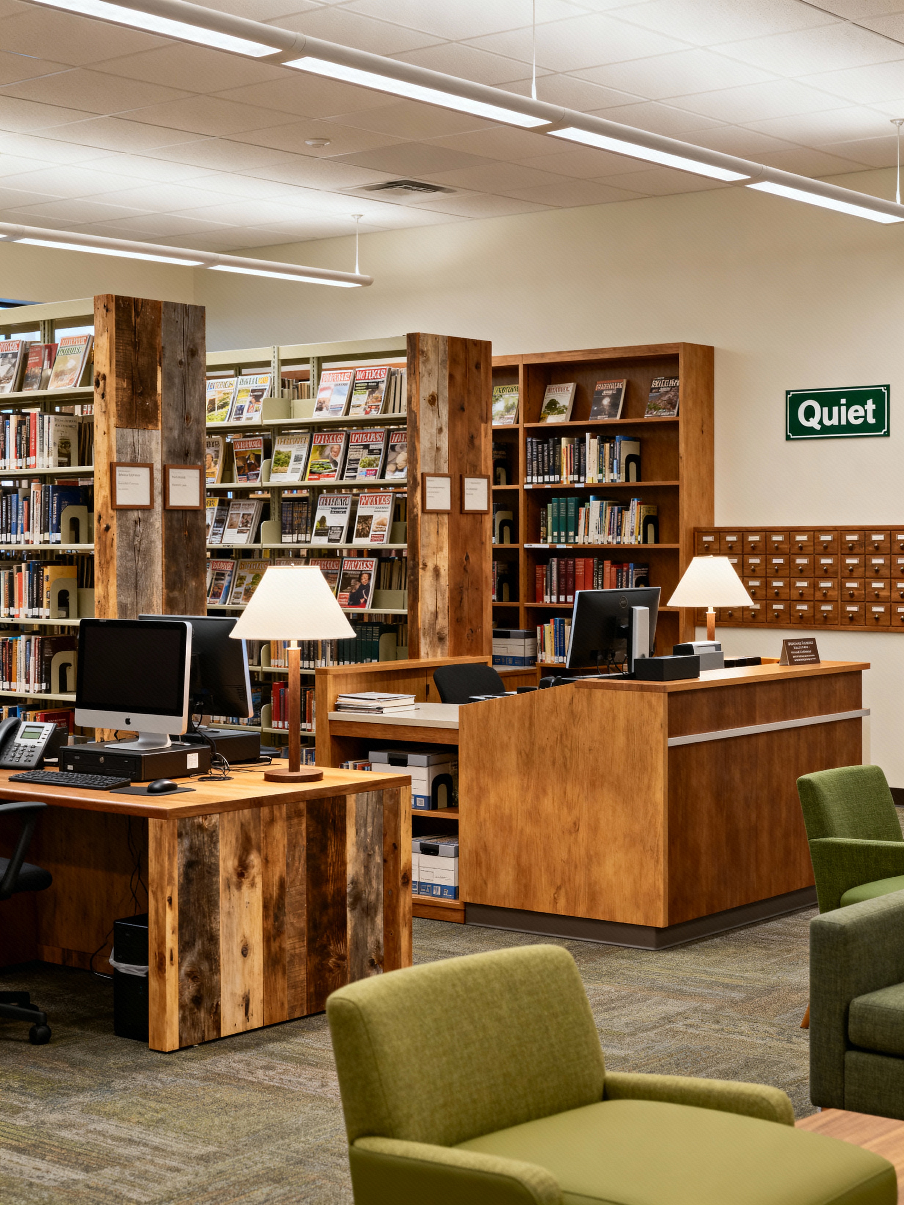 library with eco-friendly style with computer terminals and reference books and quiet signs and checkout desk and study lamps and bookshelves and periodicals and card catalogs. . with non-toxic finishes and renewable resources and reclaimed wood and environmentally conscious and energy efficient and recycled elements and organic textiles and sustainable materials
