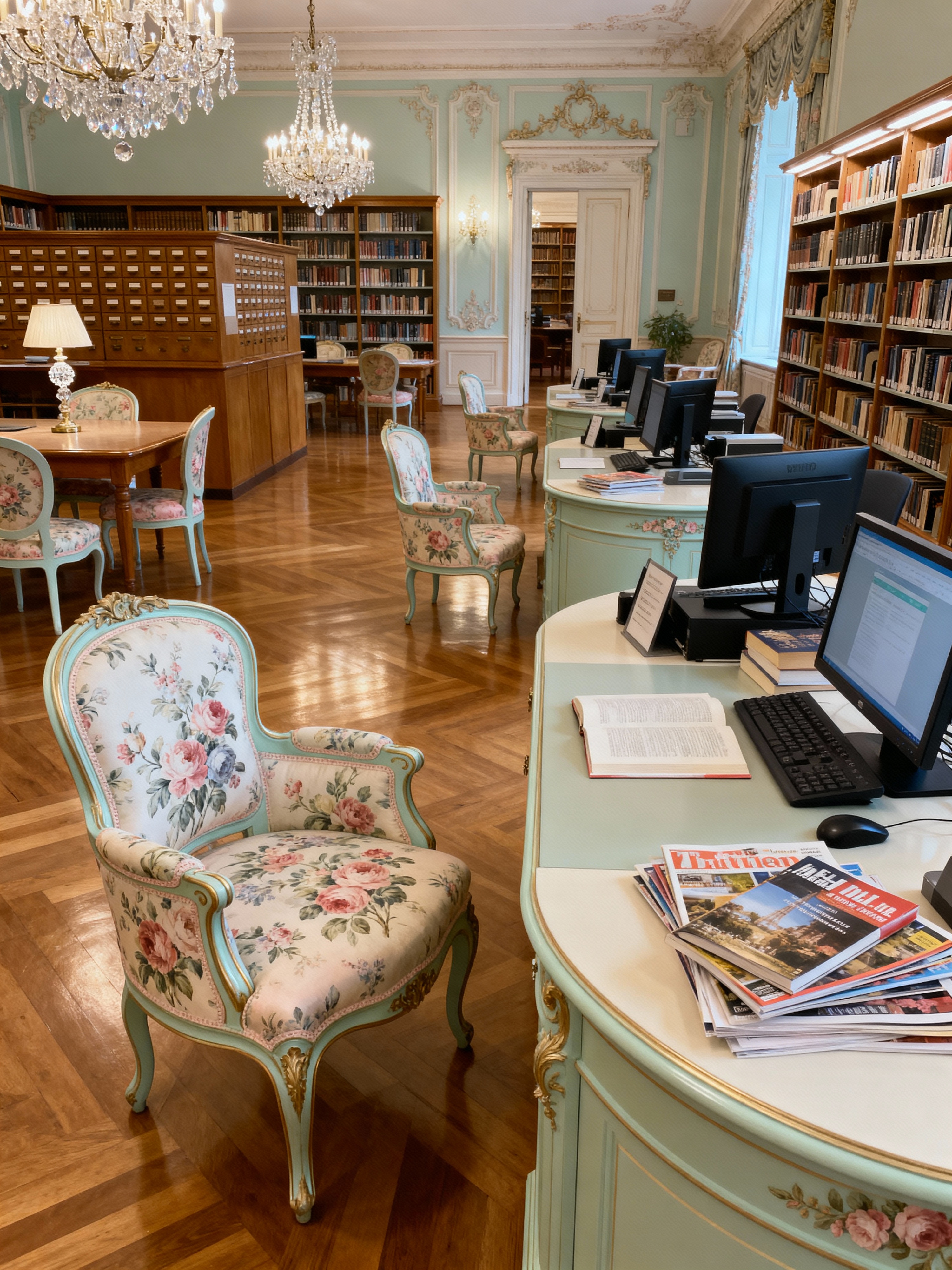 library with french style with computer terminals and card catalogs and chairs and bookshelves and periodicals and reference books and reading tables and checkout desk. . with ornate furniture and sophisticated grace and romantic style and soft pastels and refined luxury and toile patterns and crystal accents and elegant details