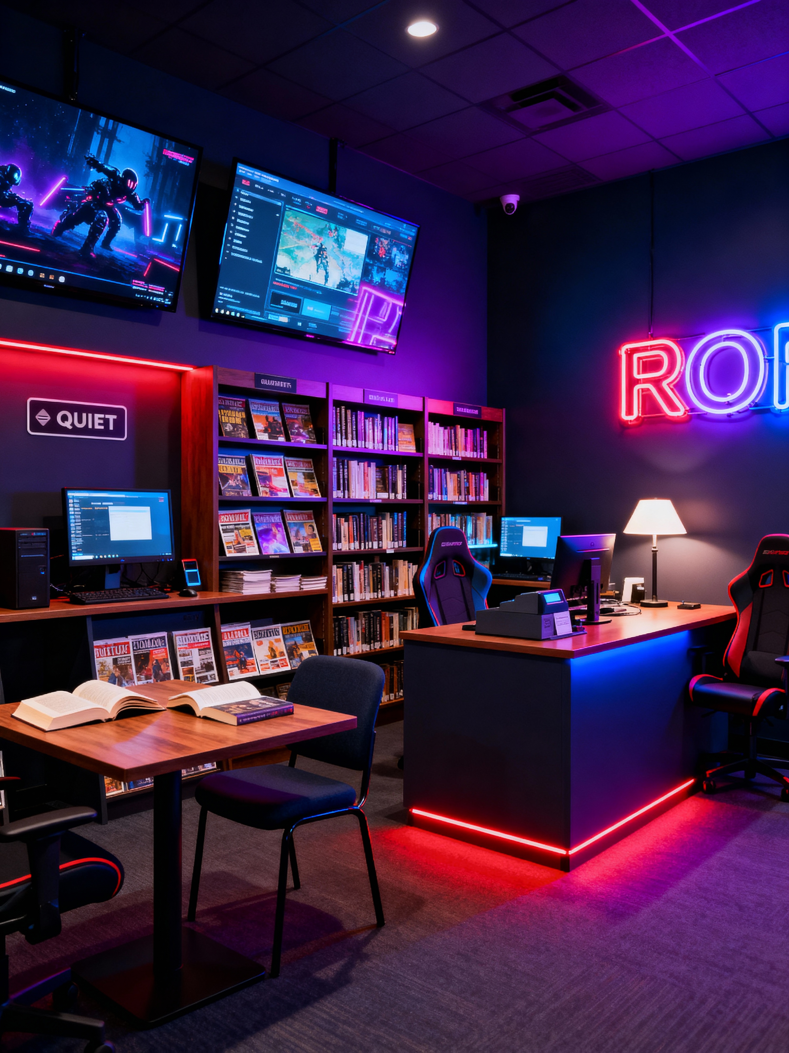 library with gaming room style with bookshelves and computer terminals and periodicals and quiet signs and reading tables and chairs and checkout desk and study lamps. . with purple, red and blue fade light and multiple displays and at night and purple and red lights and dark walls and gaming chair and neon letters on wall and dark room