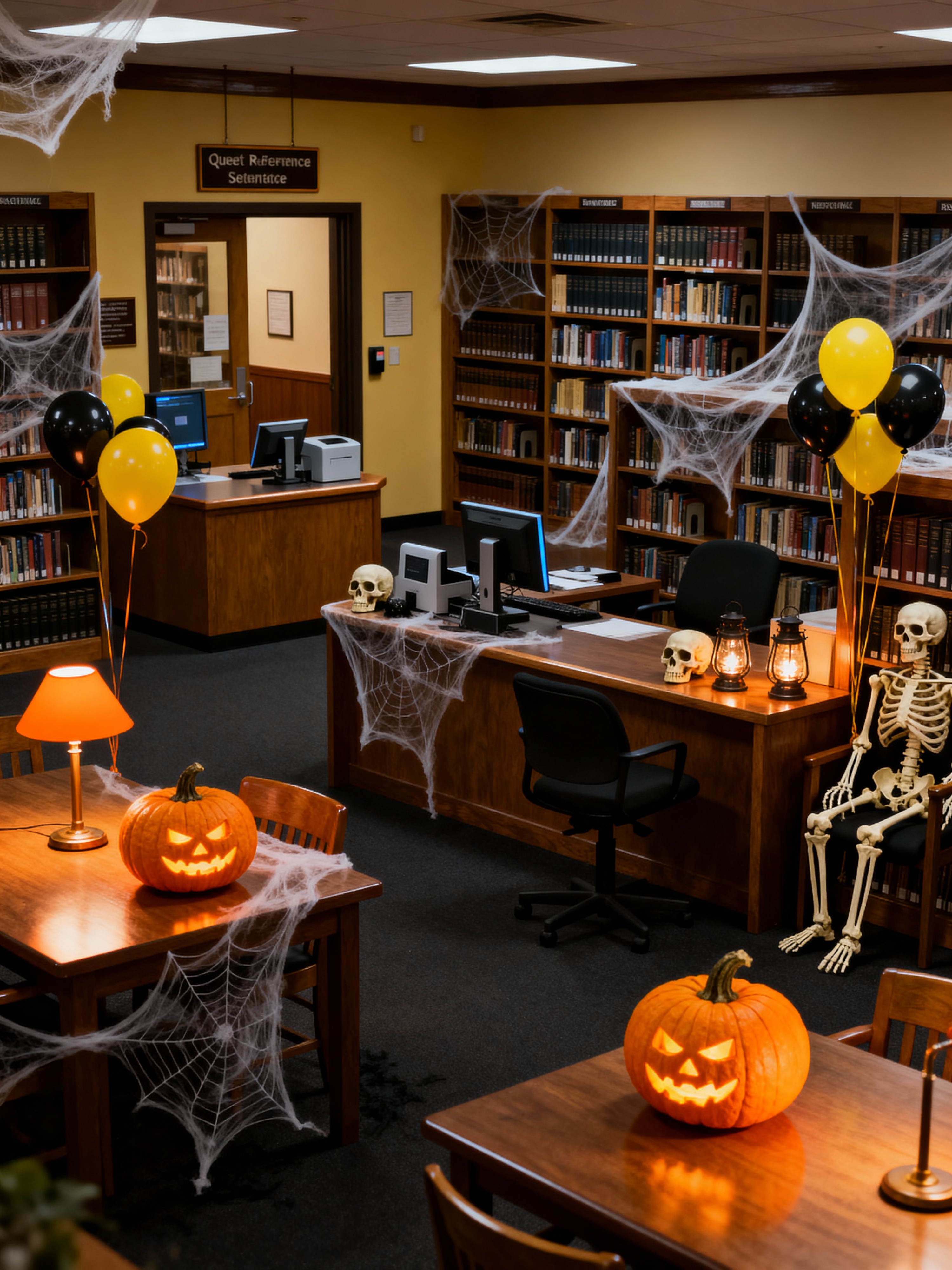 library with halloween style with reference books and chairs and computer terminals and quiet signs and reading tables and study lamps and checkout desk and bookshelves. . with cobwebs and cobwebs and glowing pumpkins and yellow black balloons and human skulls and lanterns and lanterns and skeletons sitting and standing
