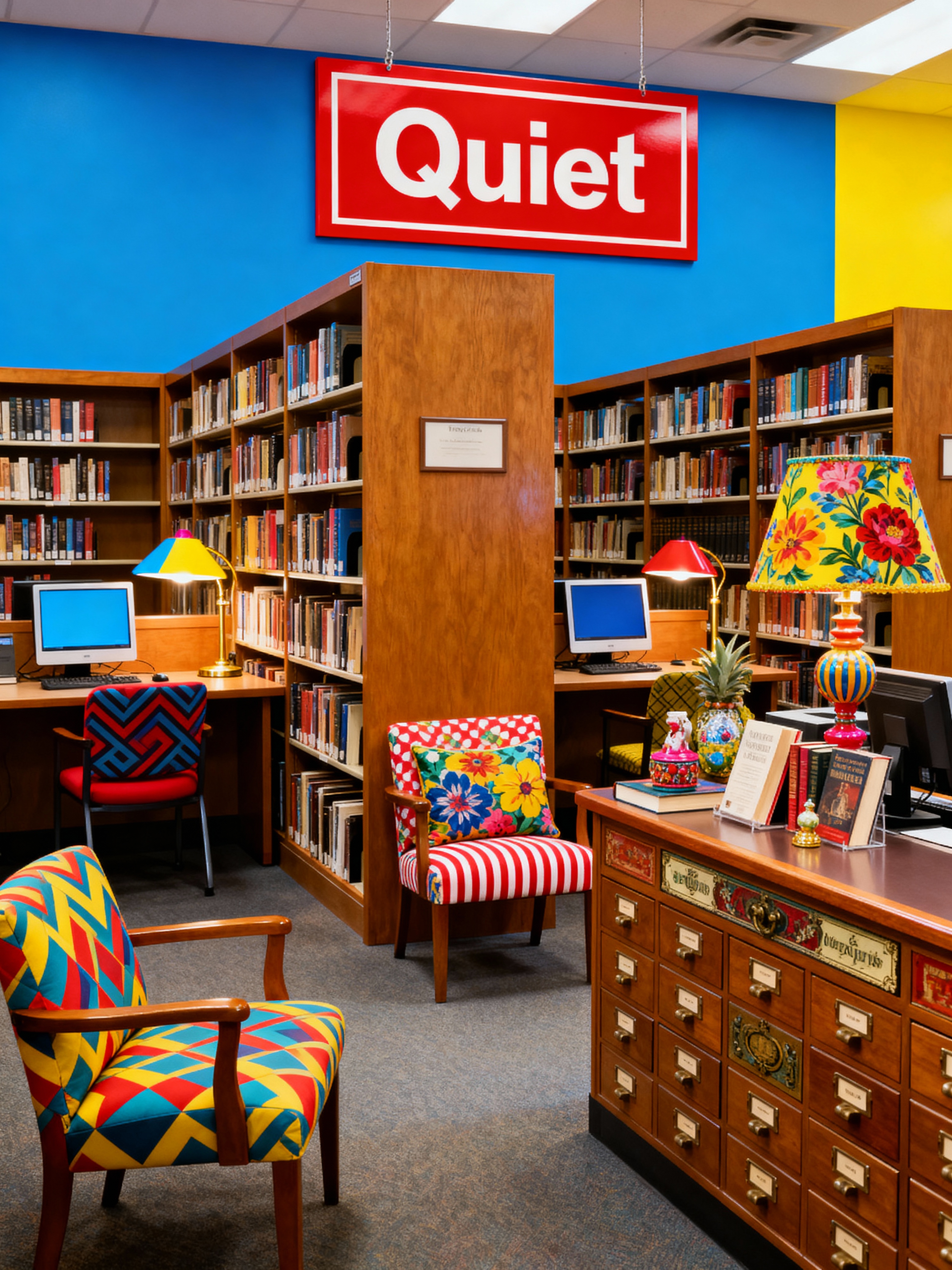 library with maximalist style with bookshelves and quiet signs and chairs and computer terminals and study lamps and checkout desk and card catalogs and reference books. . with more is more philosophy and playful and over-the-top aesthetic and bold colors and bold patterns and eye-catching and vibrant and bold creativity