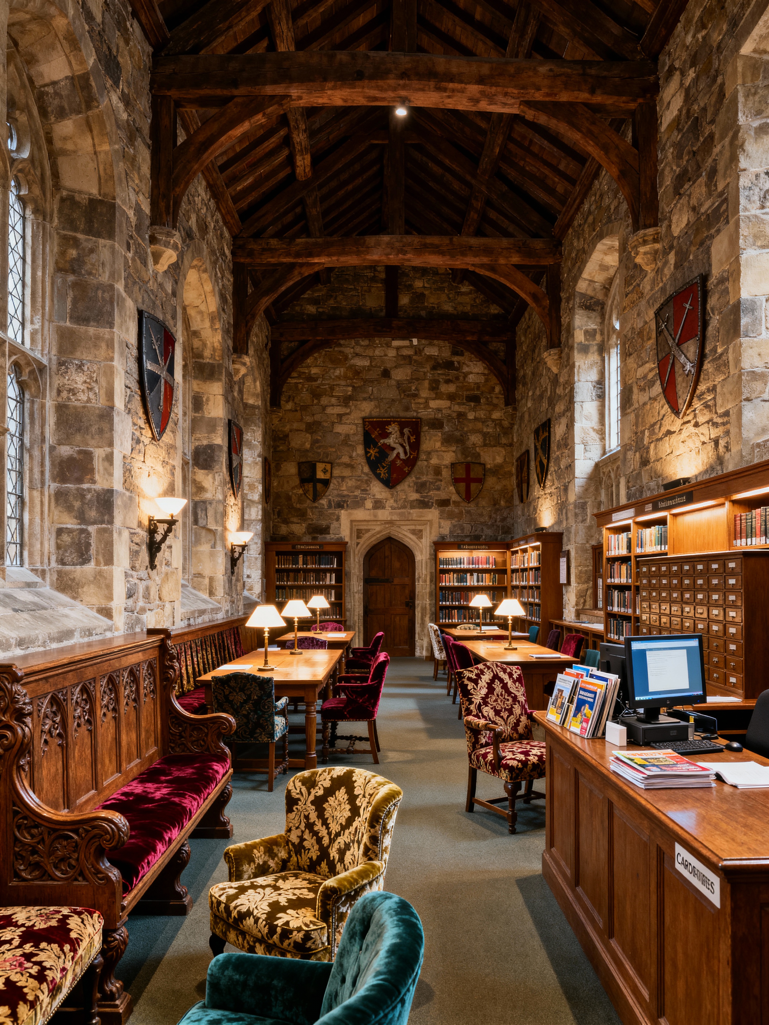 library with medieval style with chairs and periodicals and computer terminals and reading tables and study lamps and card catalogs and checkout desk and bookshelves. . with carved wooden benches and timber beams and upholstery on chairs and sofas and heavy furniture pieces and medieval shields on the wall and stone walls and timber walls and velvet, chenille, damask, and brocade draperies and fabrics