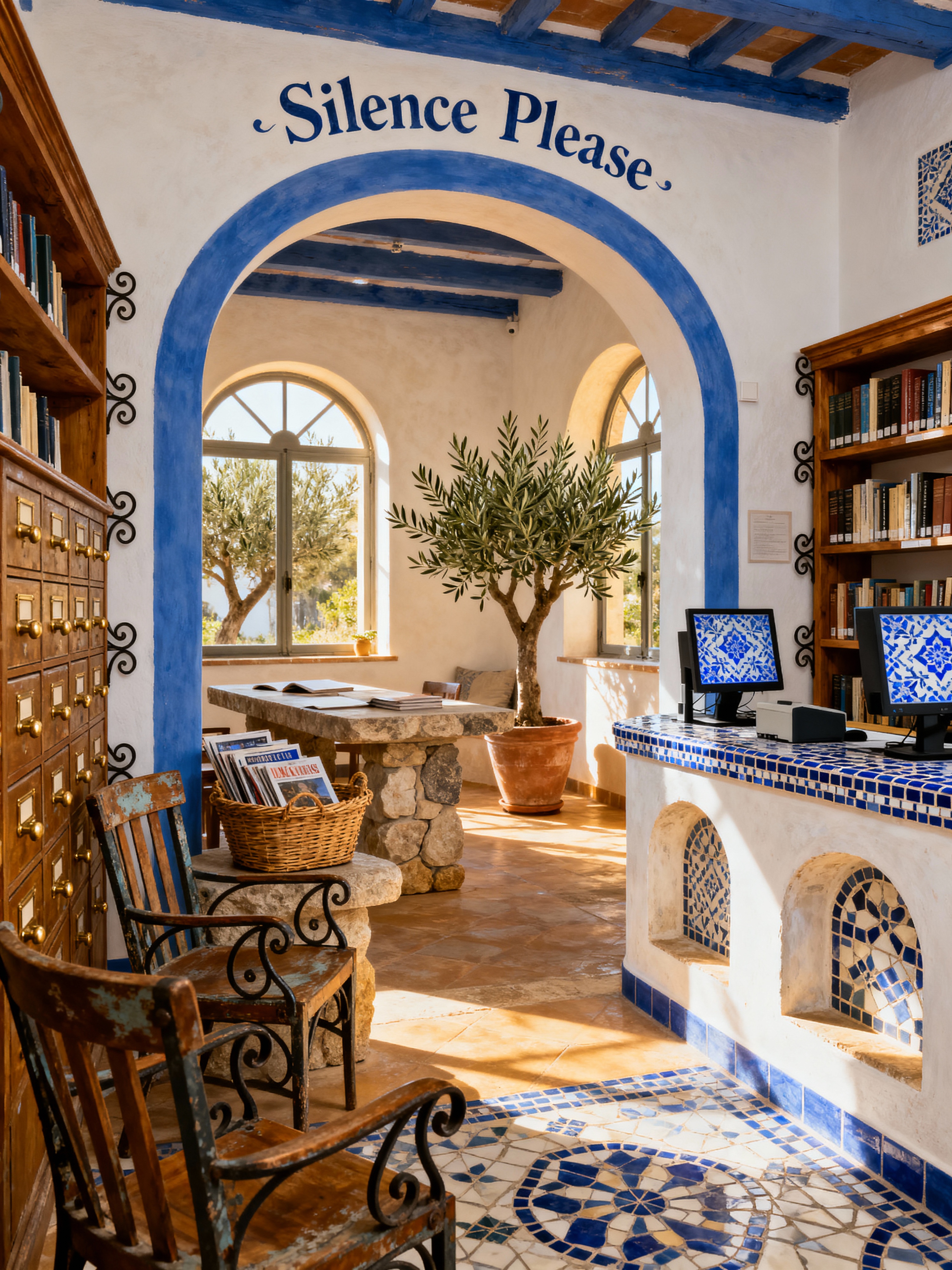 library with mediterranean style with quiet signs and chairs and card catalogs and reading tables and periodicals and computer terminals and checkout desk and reference books. . with rustic charm and sun-drenched and wrought iron and stone accents and blue and white and outdoor living and arched doorways and mosaic patterns