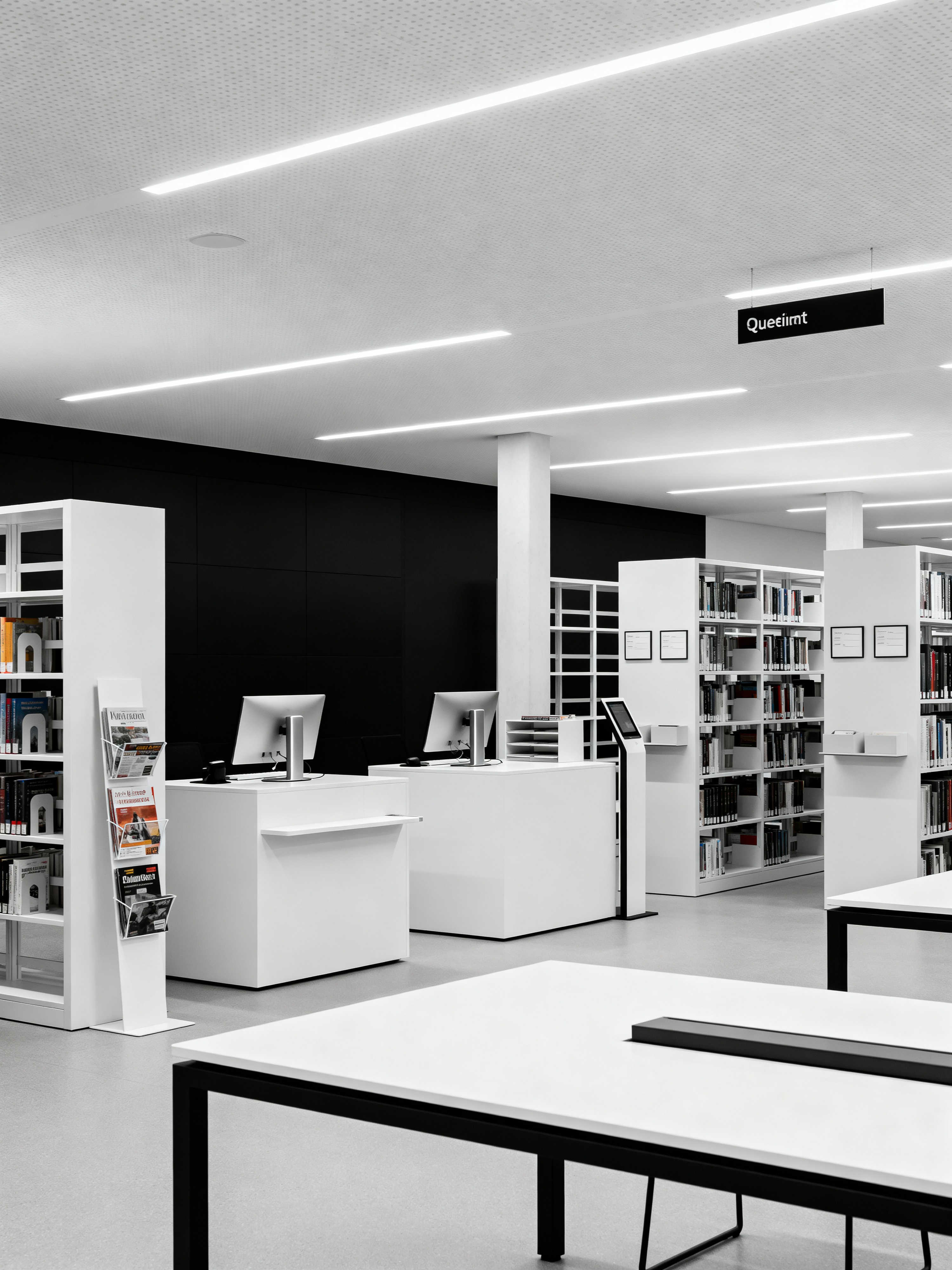 library with minimalist style with quiet signs and computer terminals and bookshelves and checkout desk and periodicals and reference books and card catalogs and reading tables. . with an open floor plan and functional furniture and clean lines and a monochromatic palette with colour used as an accent and focus on the shape, colour and texture of just a few of essential elements and lots of light and an open floor plan